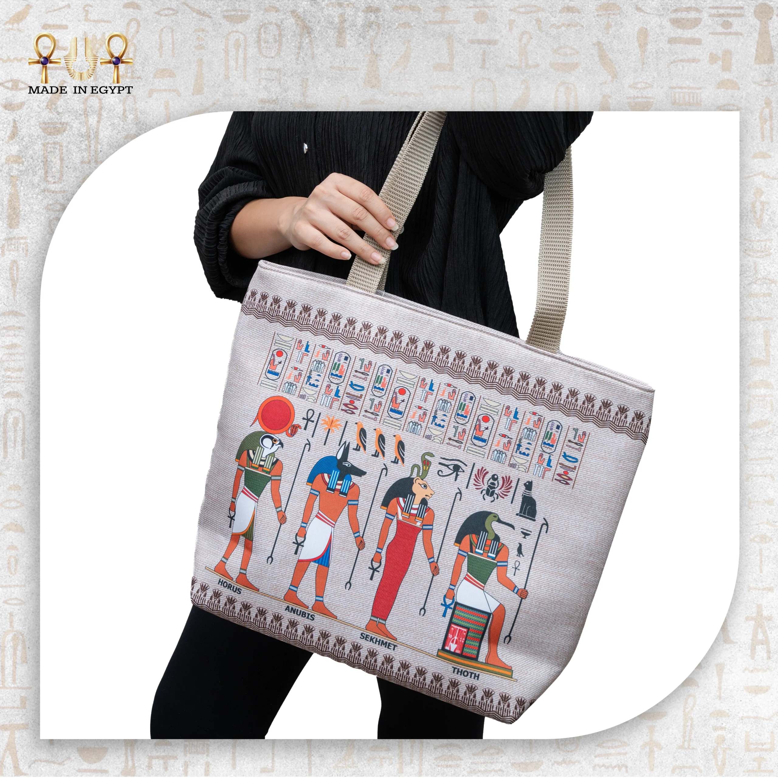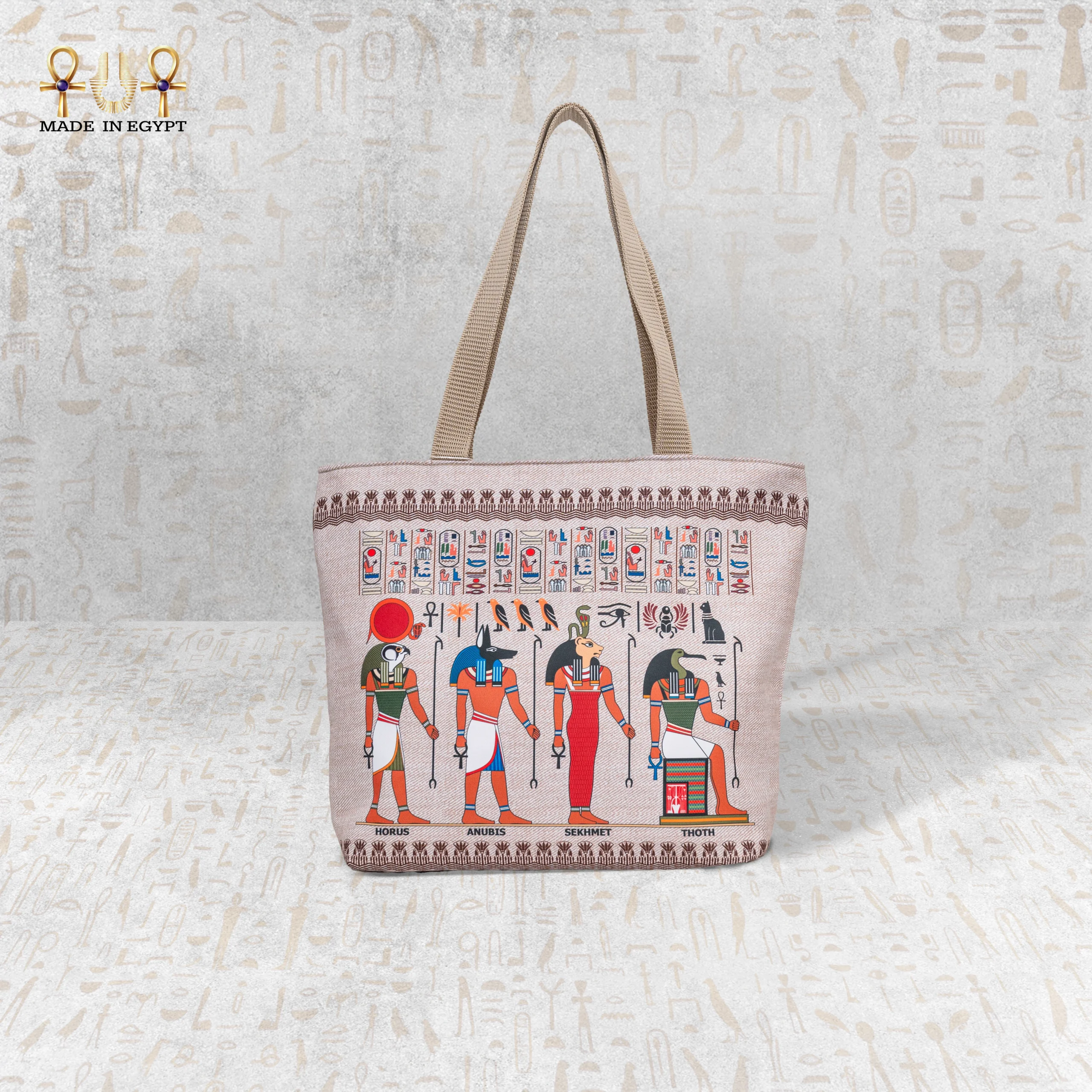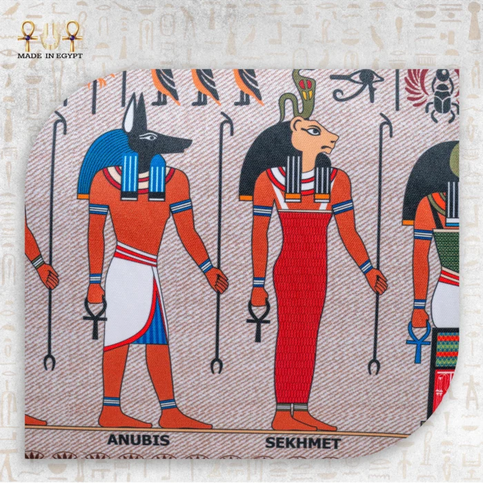 The front features a vibrant print of four iconic Egyptian gods: Horus, Anubis, Sekhmet, and Thoth. Rendered in bold colors and intricate detail, these deities represent strength, wisdom, protection, and power. The beige canvas background provides a soft contrast, allowing the artwork to shine without overwhelming your look.