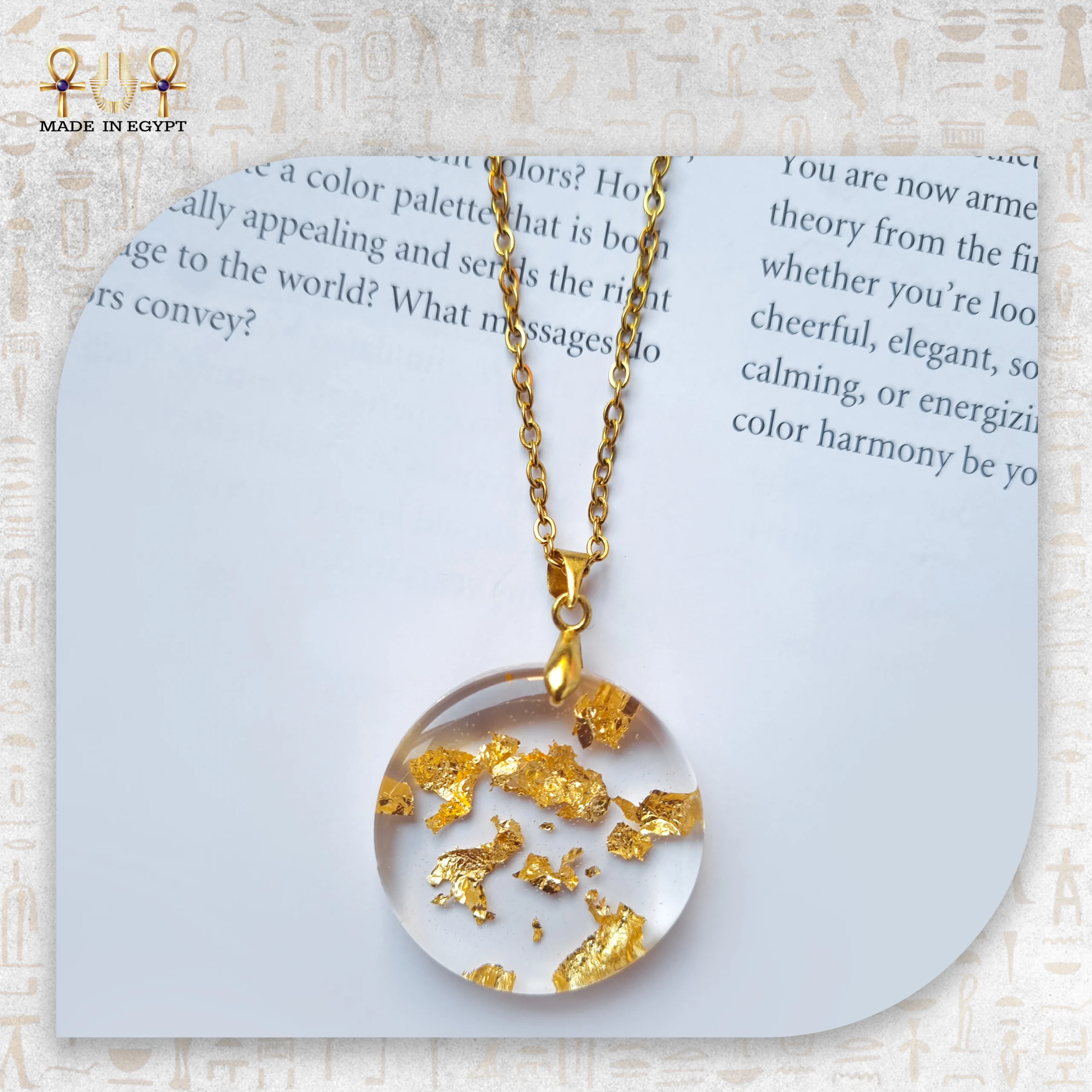 The Gold Resin Necklace blends simplicity with modern luxury in a soft and elegant style. It features a round pendant made from high-quality transparent resin. Inside the resin, delicate gold foil flakes float beautifully, creating a luminous effect that catches the light with every movement. This clean and refined design suits everyday outfits, yet it looks elegant enough for special occasions.