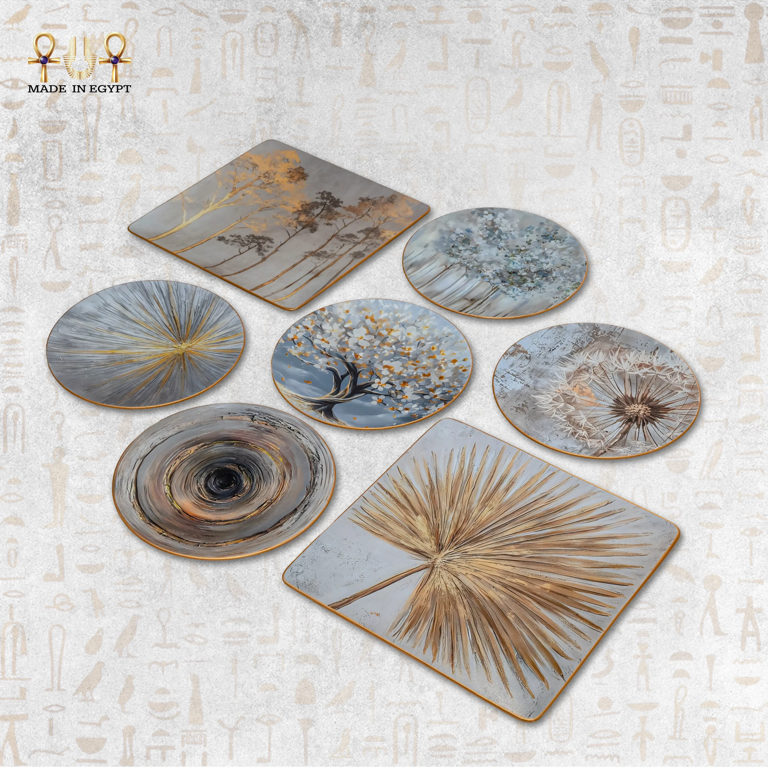 The Gold Trees Collection brings natural beauty and luxurious elegance into any space. This handcrafted set features plates with soft grey tones accented by shimmering gold highlights, creating a sophisticated and calming visual effect. Each plate showcases trees, flowers, and abstract designs rendered with high-quality decoupage techniques, offering depth, clarity, and a refined finish.