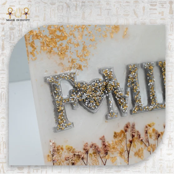 A premium resin board featuring FAMILY lettering with gold, crystals, and dried flowers—adding warmth and elegance to any home.