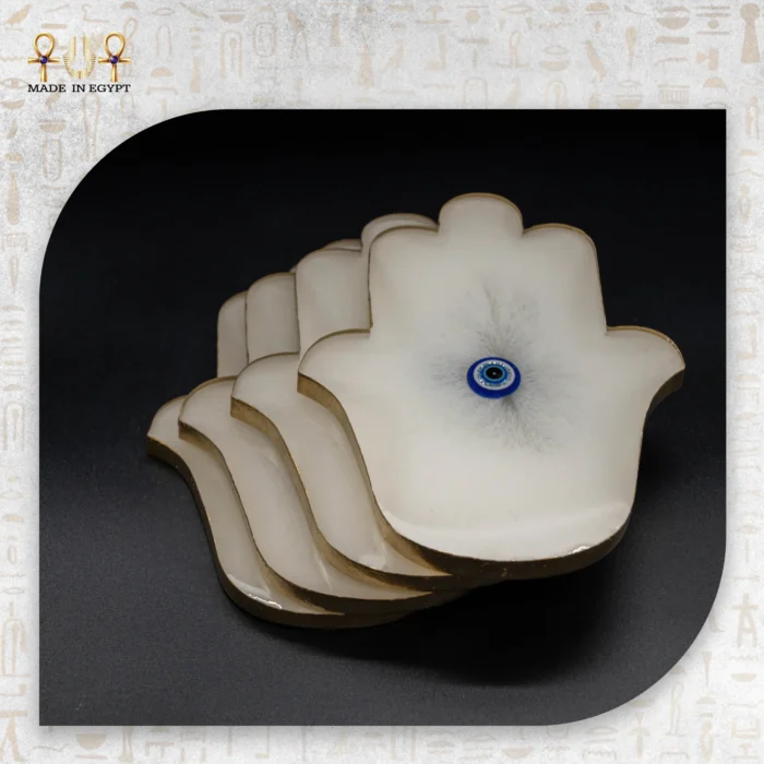 The resin Hamsa coasters come in a set of 4 pieces for each color, available in three shades: blue, white, and off-white. Designed in the protective Hamsa hand shape, each piece features a blue eye in the center. The coasters are practical for protecting surfaces while also serving as elegant décor that adds positive energy and a beautiful touch to any corner of your home.
