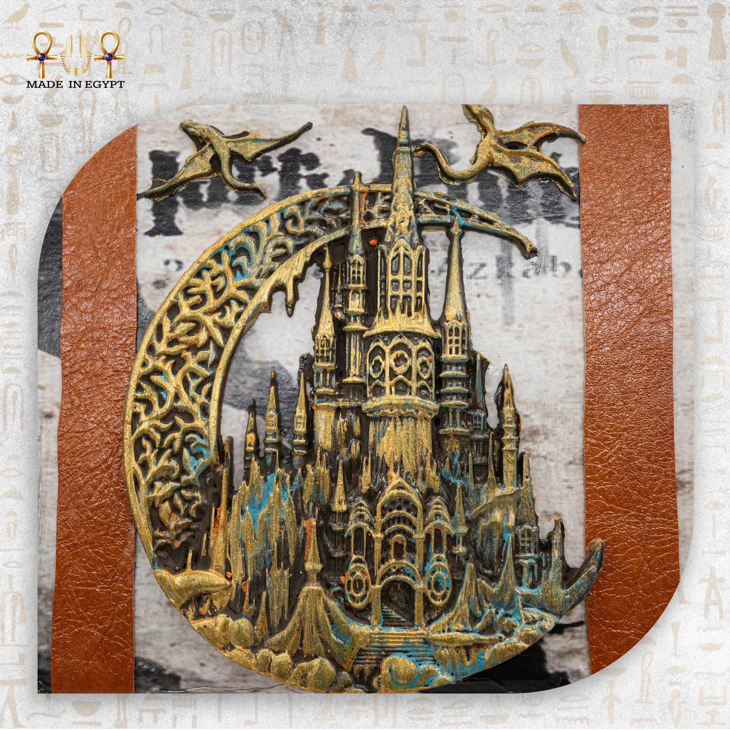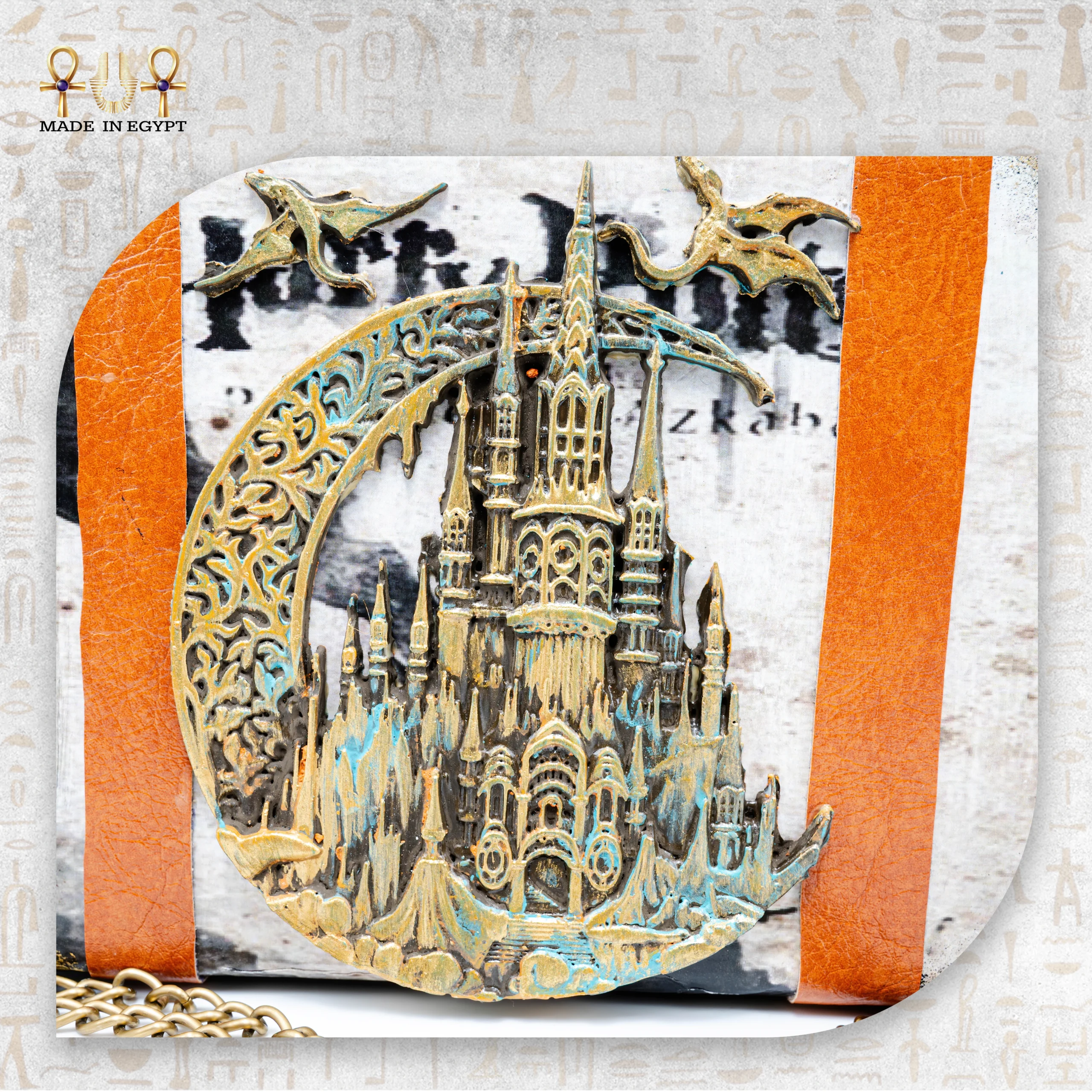 The bag features raised metallic embellishments in antique gold. These details include a wizard’s hat, classic magical symbols, a golden bird, and an ornate arch framing the castle illustration. Each element adds depth and artistic richness.