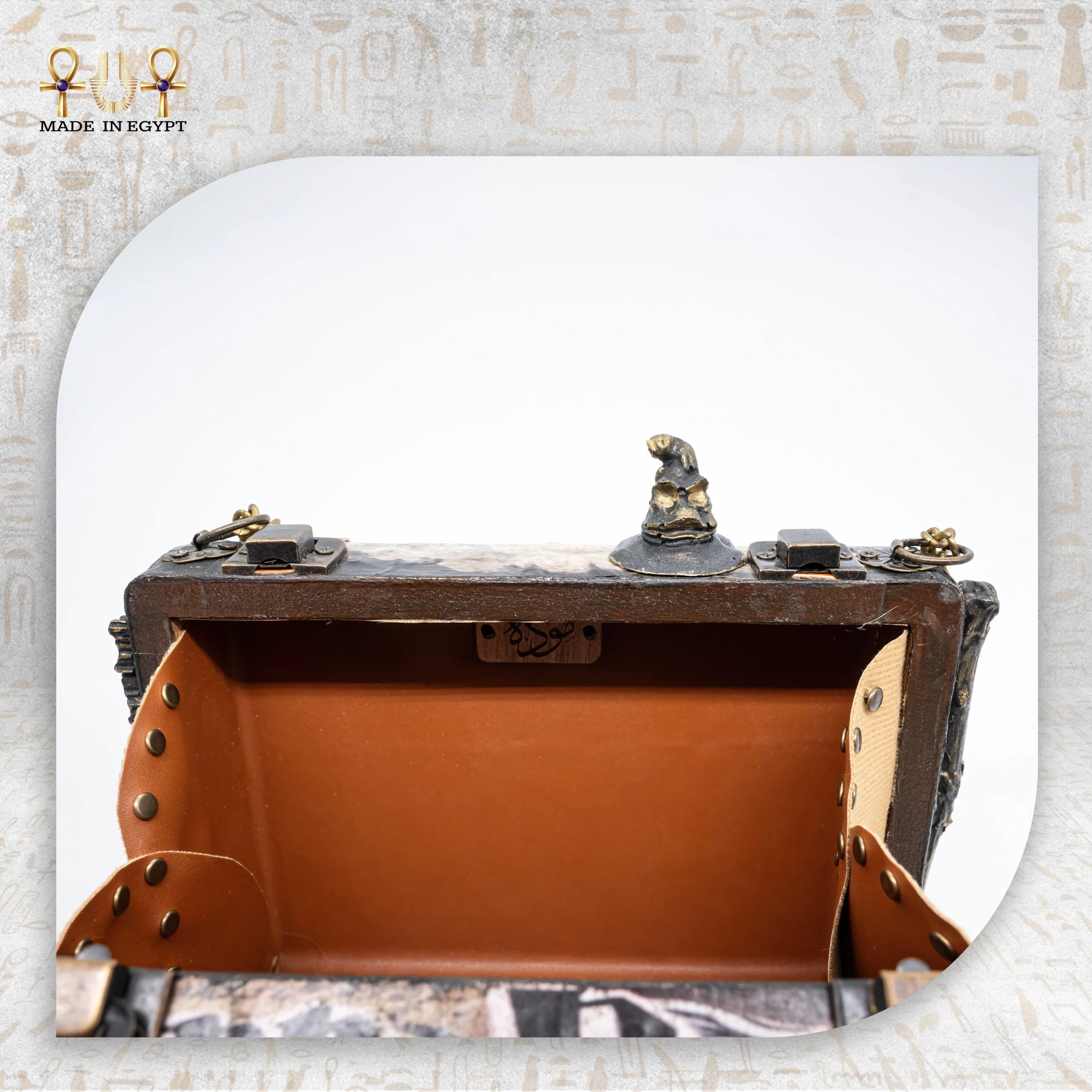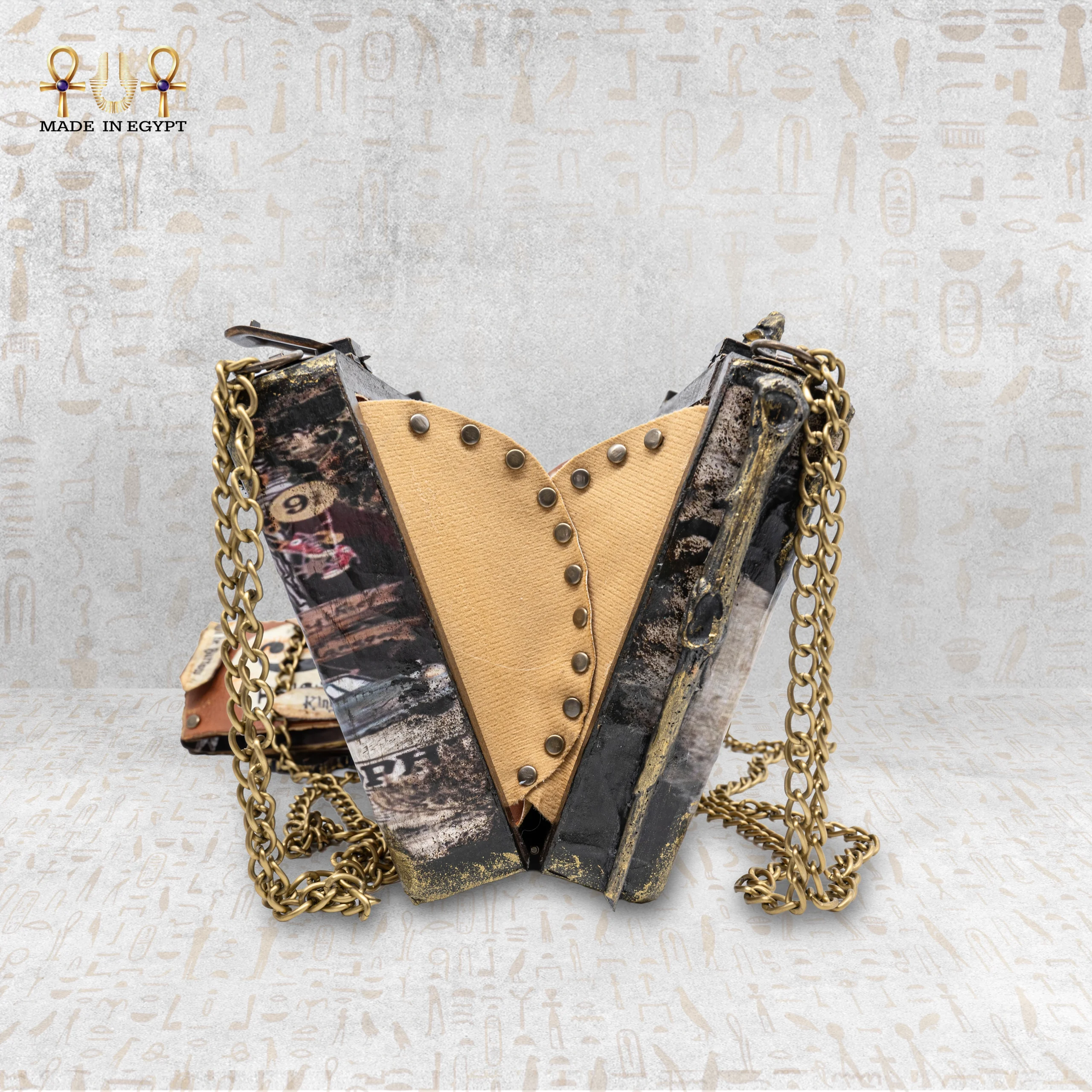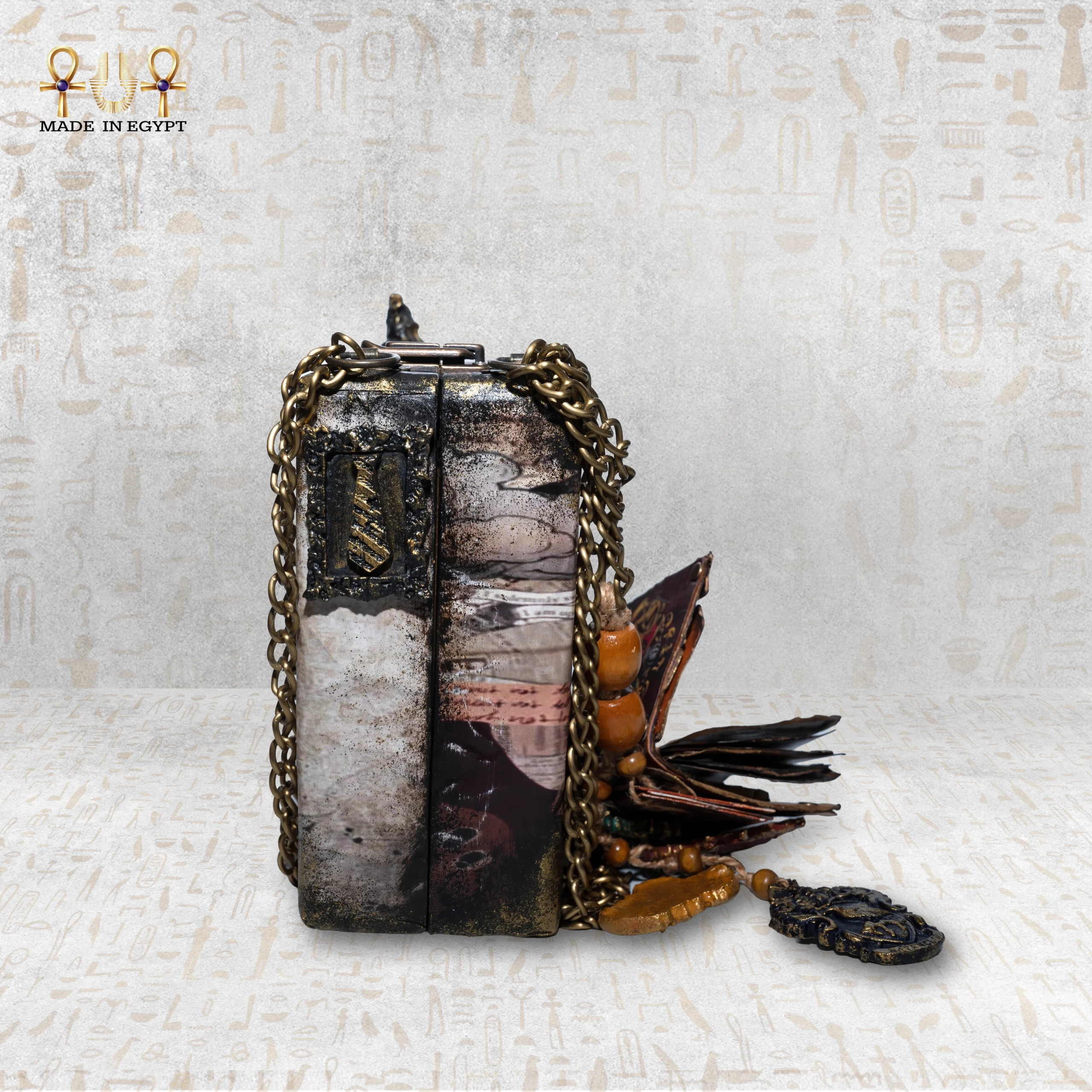 Brown leather straps on the front enhance the old-book-inspired theme. They add texture and reinforce the handcrafted feel of the bag. Meanwhile, the antique gold shoulder chain matches the decorative elements perfectly.