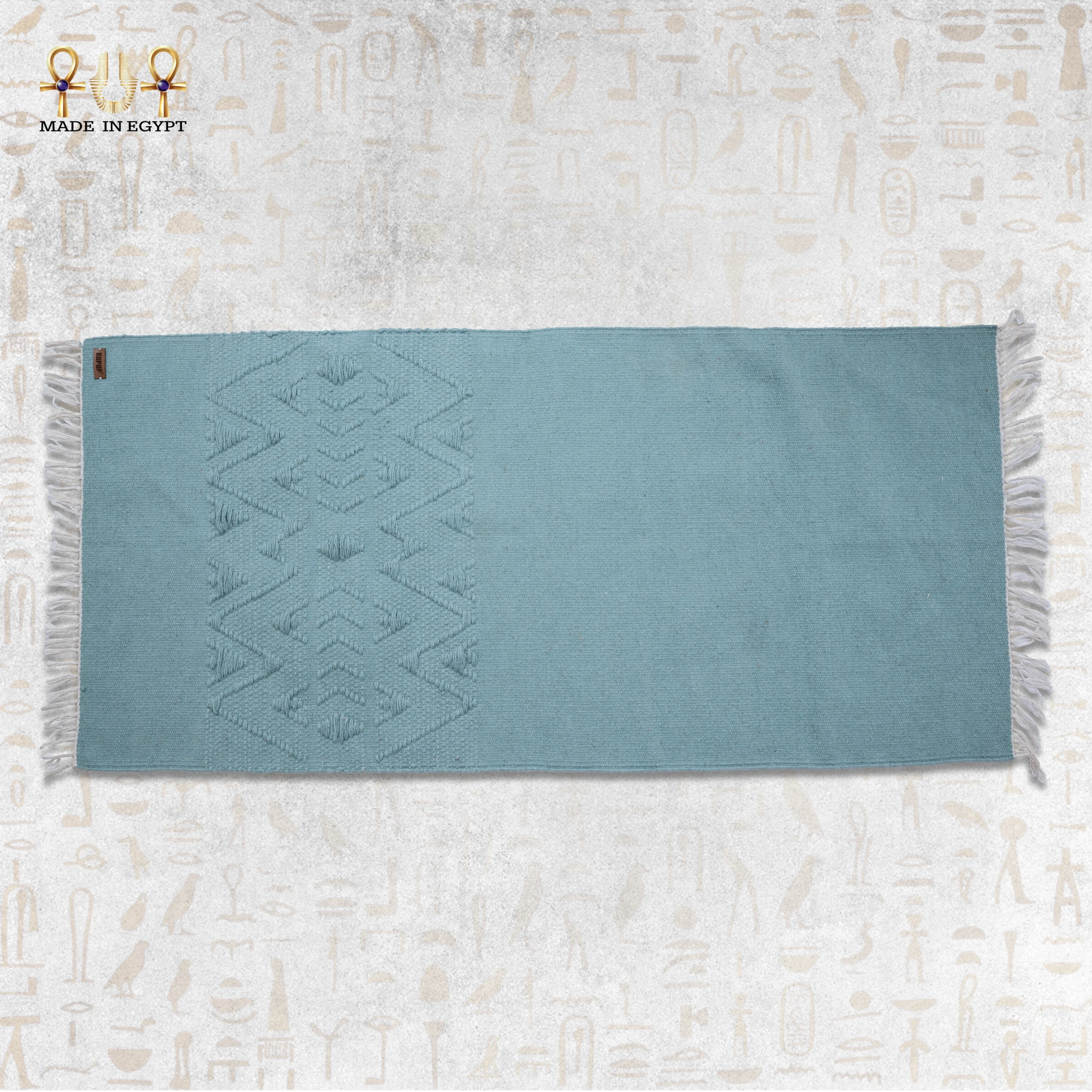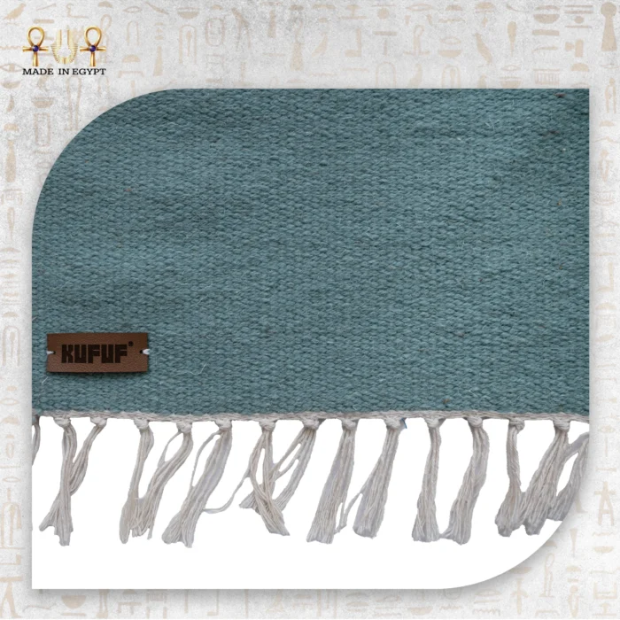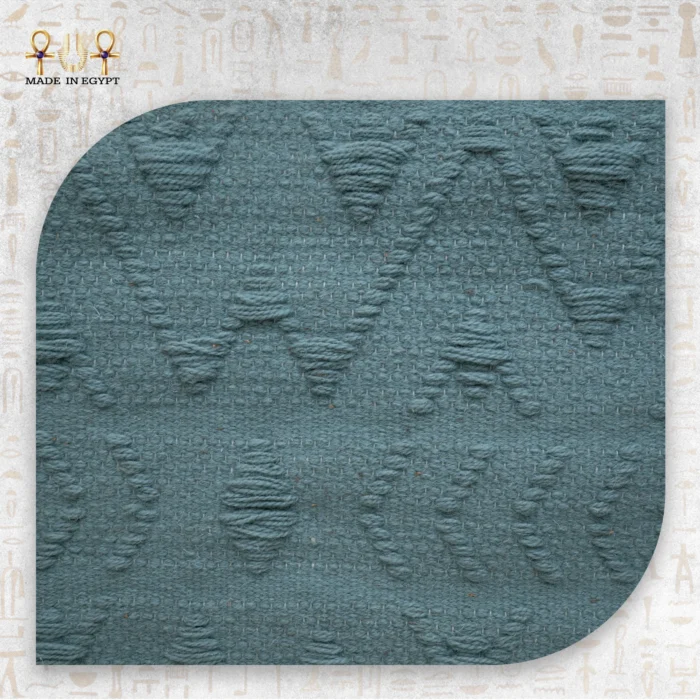 Each Horizon Calm Rug is meticulously woven by Egyptian artisans using 100% pure cotton. They combine traditional weaving techniques with modern aesthetics, resulting in a soft yet durable texture. The muted blue-green shade reflects the hues of the horizon at dawn, while the raised geometric details add depth and subtle movement. Moreover, the gentle color palette promotes relaxation and connection with nature.