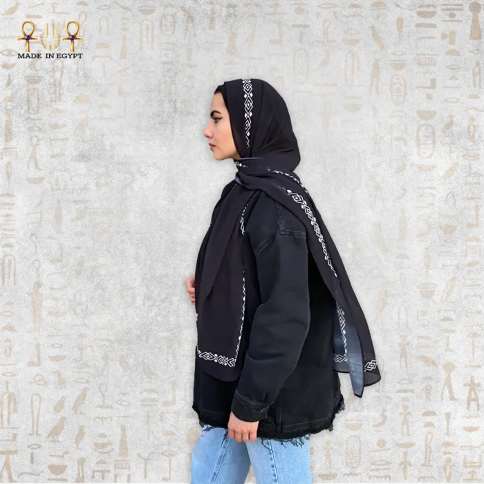 Elegant chiffon scarf in black with geometric patterns for a luxurious touch.