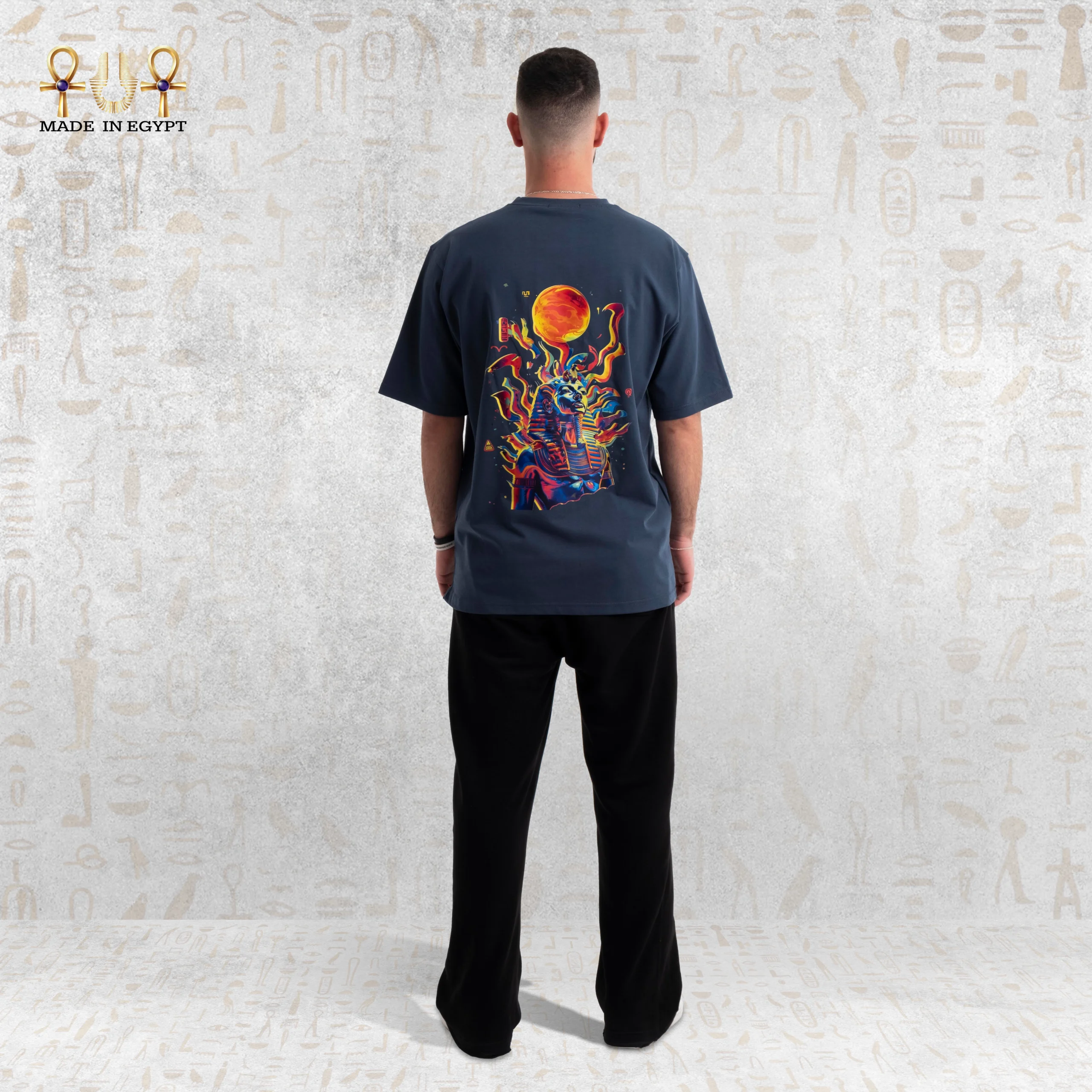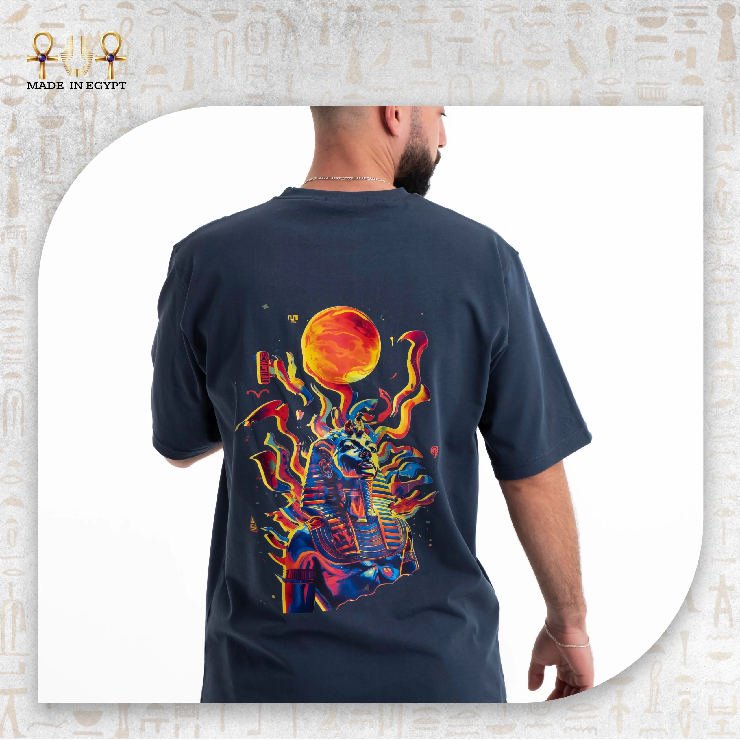 Every detail is infused with meaning. The sun represents eternal life, a core belief in ancient Egyptian culture. The fiery textures symbolize energy, strength, and the never-ending rhythm of life. The bold interplay of colors transforms the tee into a wearable canvas, blending history with modern artistic flair.