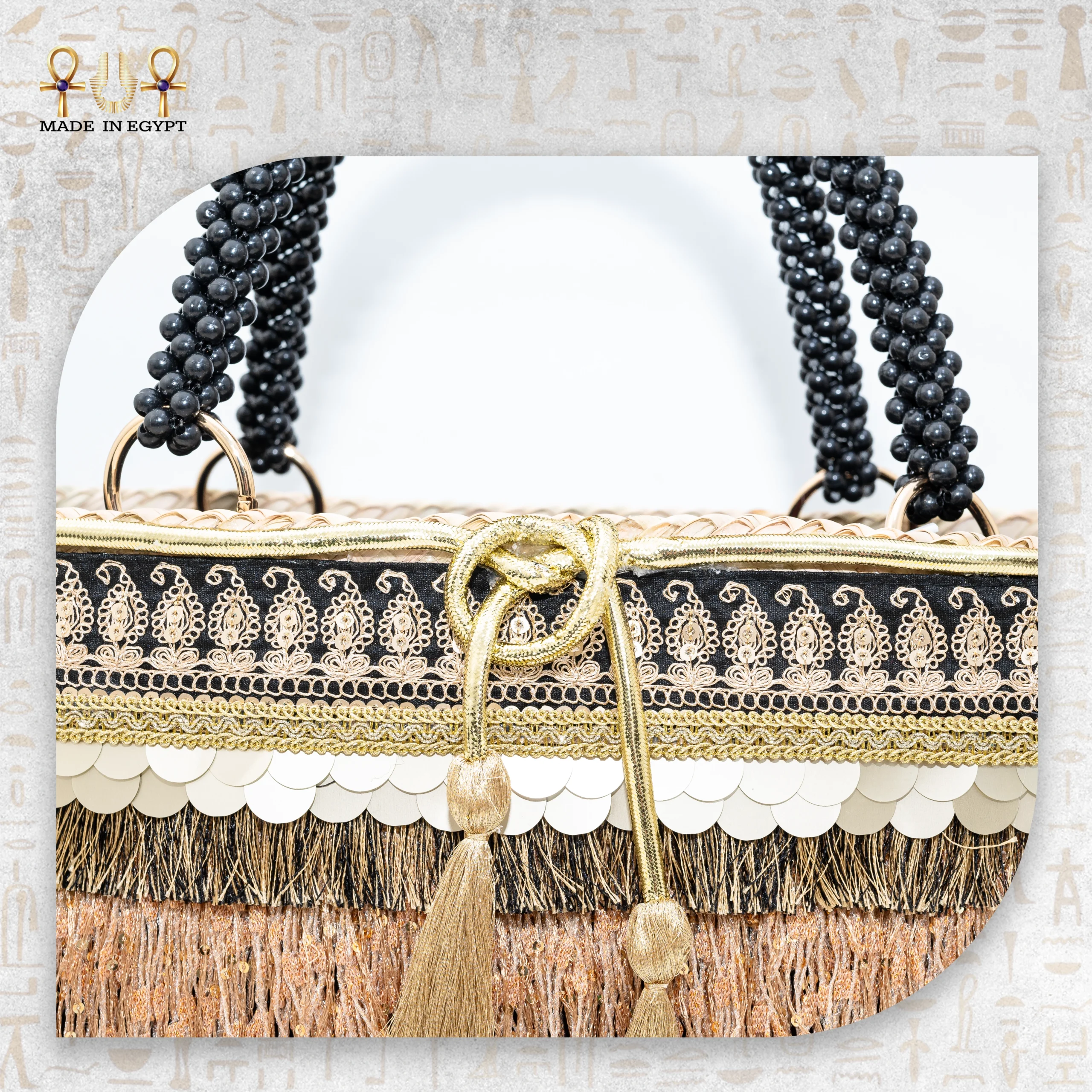 Layered fringes in gold, beige, and black move elegantly with every step. They create depth, contrast, and a soft flowing effect. Above the fringes sits an embroidered Indian-style band in black and gold. Its ornamental motifs add sophistication and cultural charm. A row of golden metallic discs sits below the band and reflects light beautifully, giving the tote a glamorous, shimmering touch.