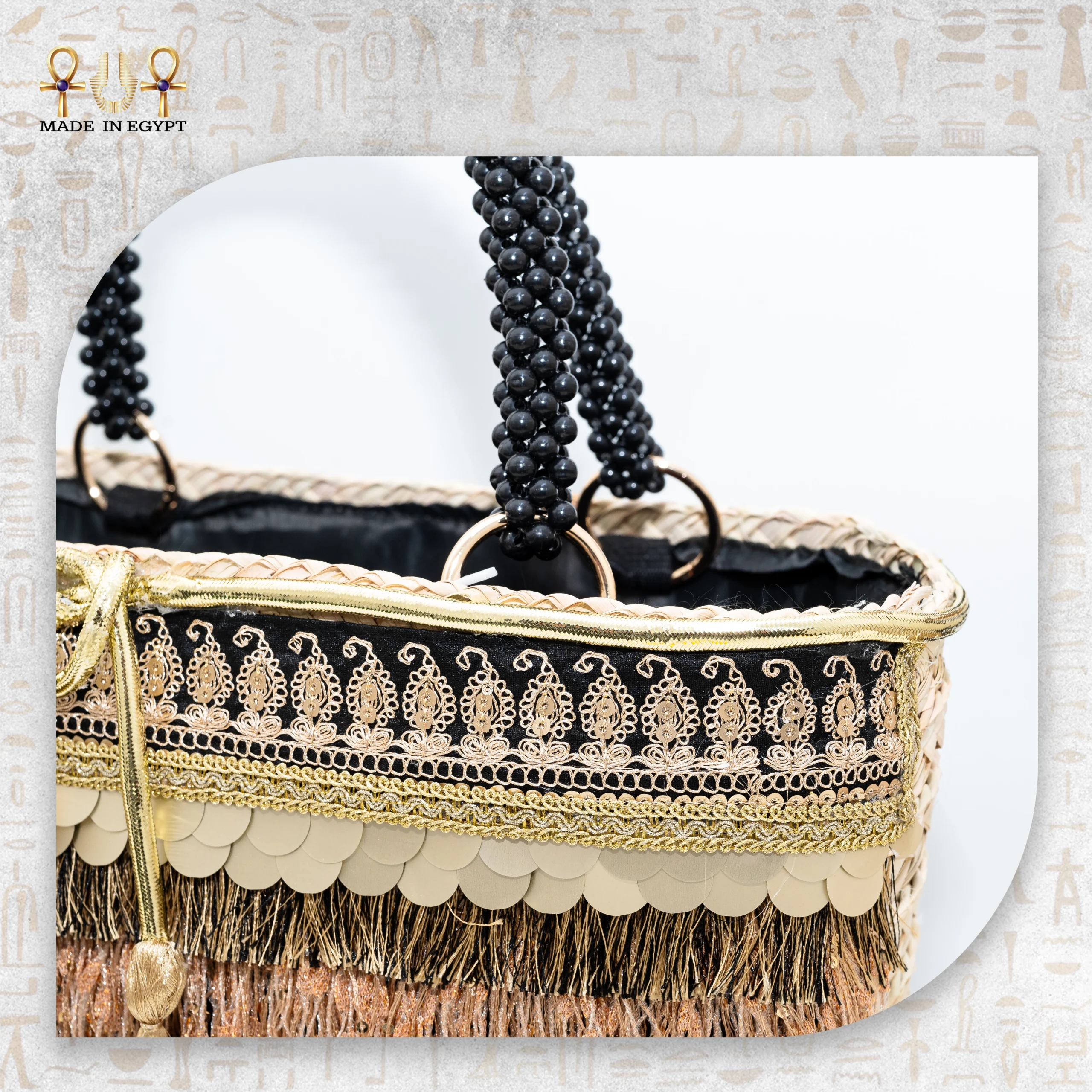A handcrafted woven tote with luxurious fringe layers and golden Indian embroidery.
