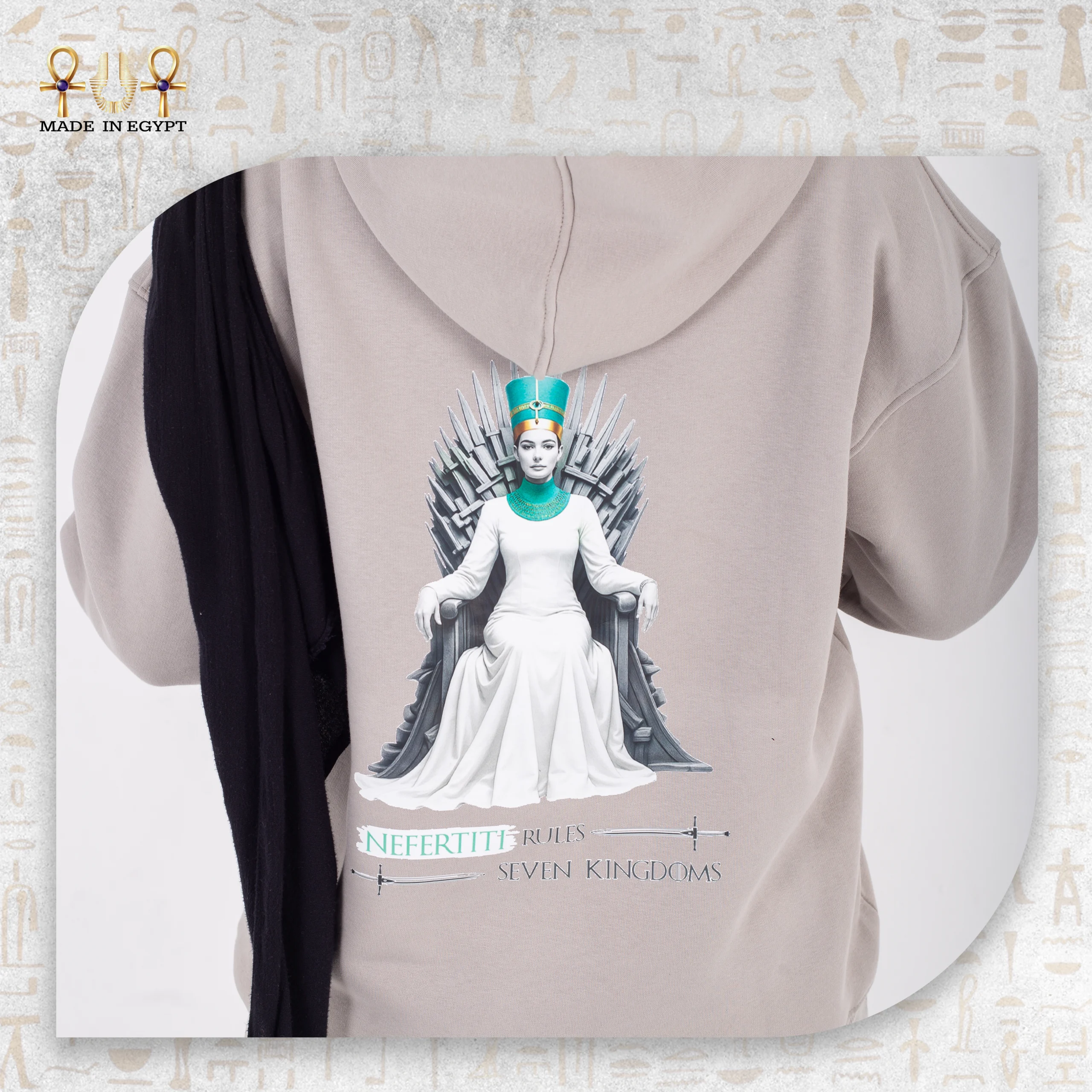 The Nefertiti Throne Hoodie is more than a hoodie — it is a bold artistic statement merging ancient Egyptian royalty with epic fantasy storytelling. Inspired by Game of Thrones-style visuals, the design portrays Queen Nefertiti seated on a metallic throne, combining historical elegance with modern pop-culture aesthetics.