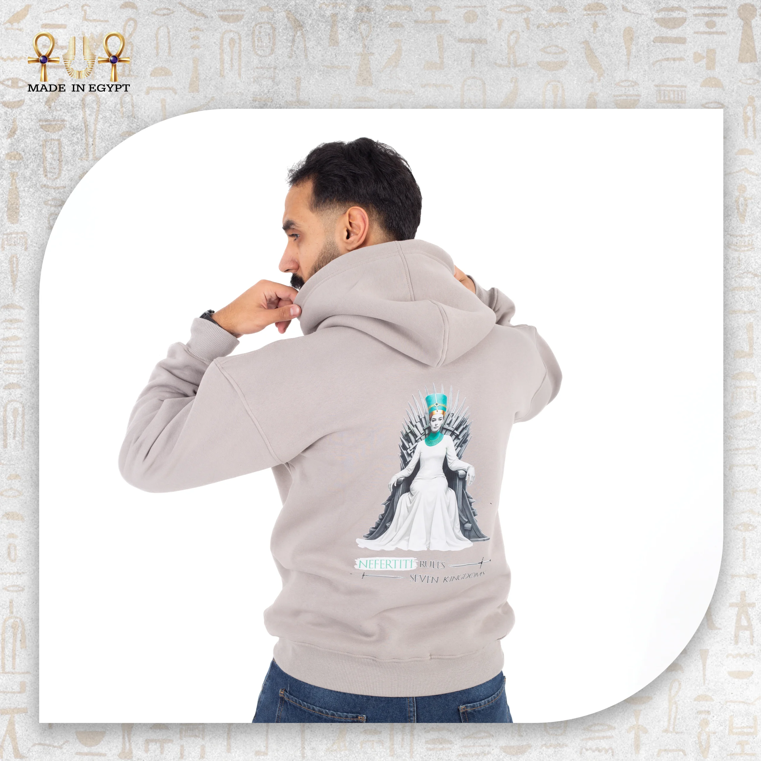 A Relaxed Fit Unisex Hoodie featuring Queen Nefertiti seated on a throne, inspired by epic fantasy aesthetics. Blending ancient Egyptian royalty with modern storytelling, this hoodie represents power, elegance, and timeless leadership — crafted from high-quality fabric and proudly made in Egypt.