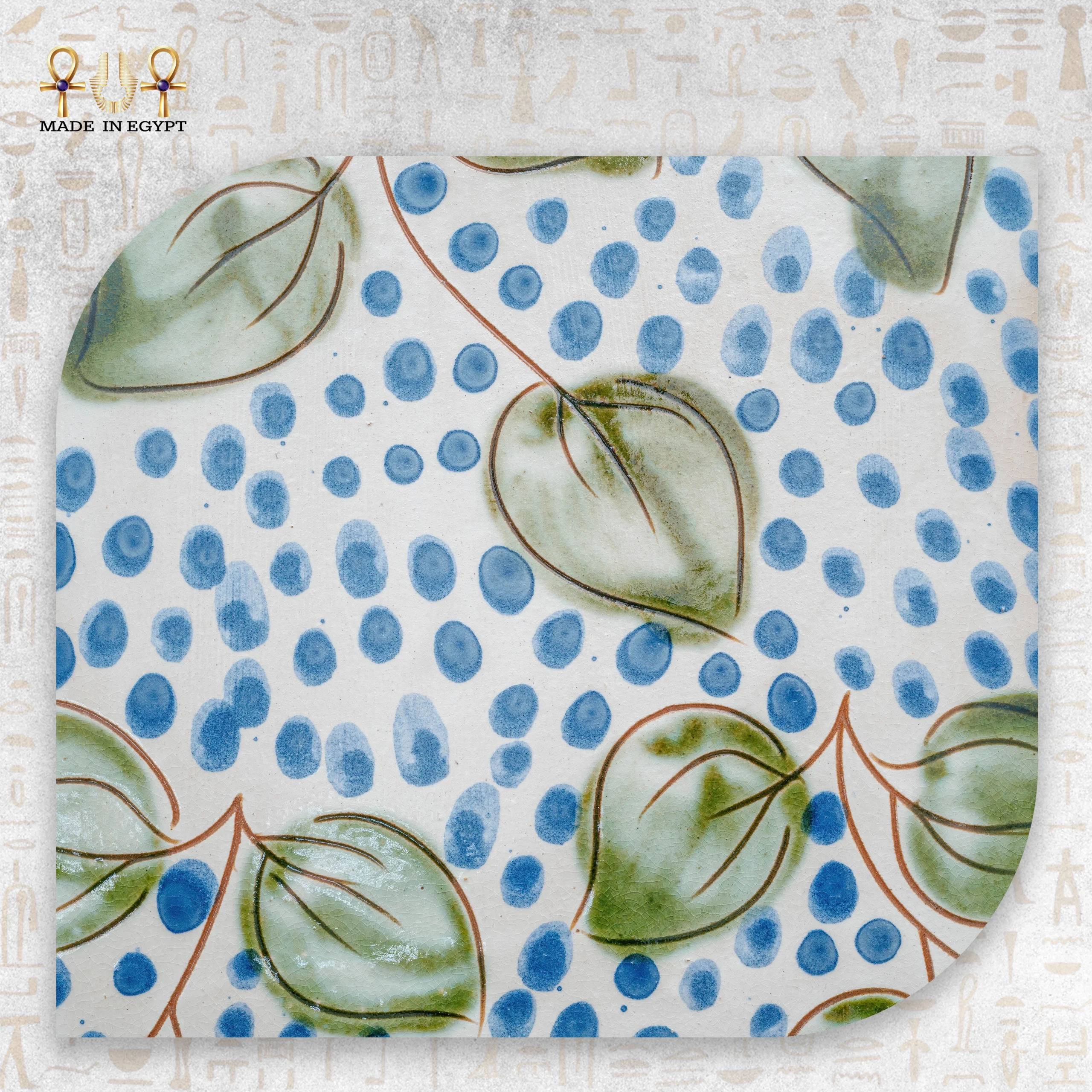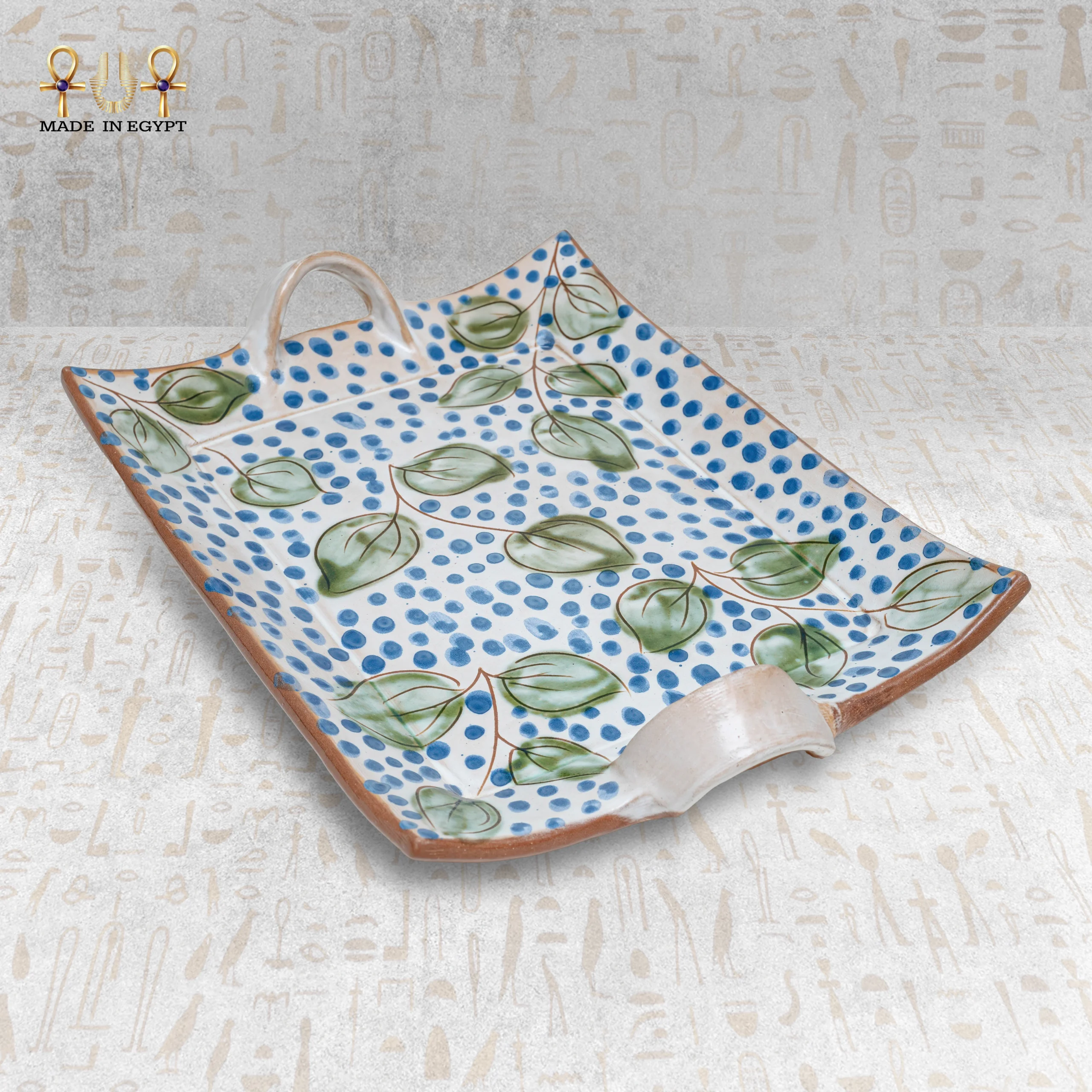 A handmade ceramic serving tray featuring delicate green leaves and playful blue dots, bringing a fresh, nature-inspired charm to your dining table or home décor.