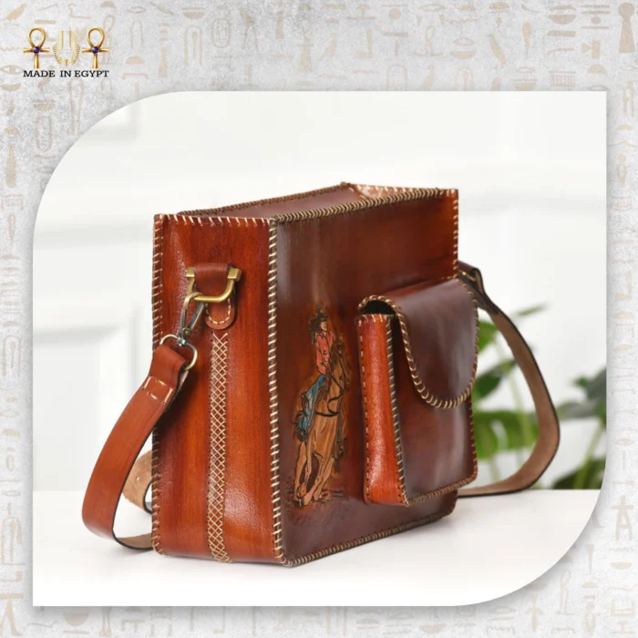 A handcrafted leather bag made from premium full-grain cowhide, featuring a hand-burned illustration colored with Italian dyes and fully hand-stitched construction. Lined with natural goat leather and designed in a functional 25 × 22 × 8 cm size, it blends artisanal craftsmanship with everyday practicality — a timeless piece that ages beautifully and never repeats itself.