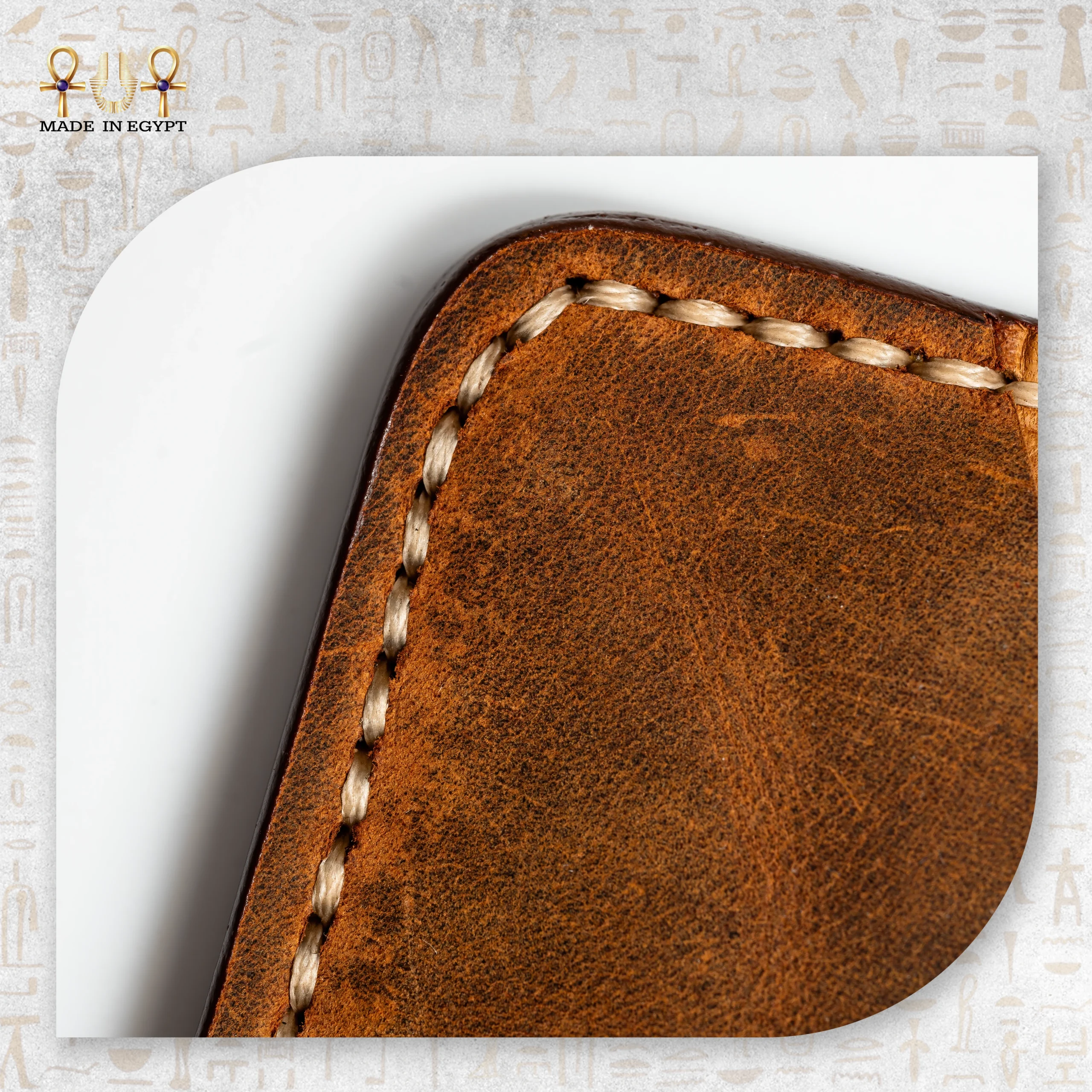 A premium leather luggage tag crafted from full grain cowhide leather for easy luggage identification.