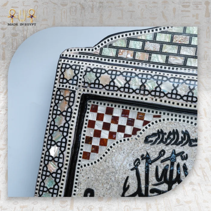 The Light of Tawakkul wall panel is a refined artwork that blends spiritual elegance with traditional oriental craftsmanship. The piece is meticulously inlaid with natural mother of pearl and mosaic details along its borders, creating a stunning iridescent shine that changes beautifully under the light. Designed in the shape of an authentic Islamic mihrab, the frame adds a strong architectural presence suitable for both classic and modern interior spaces.
