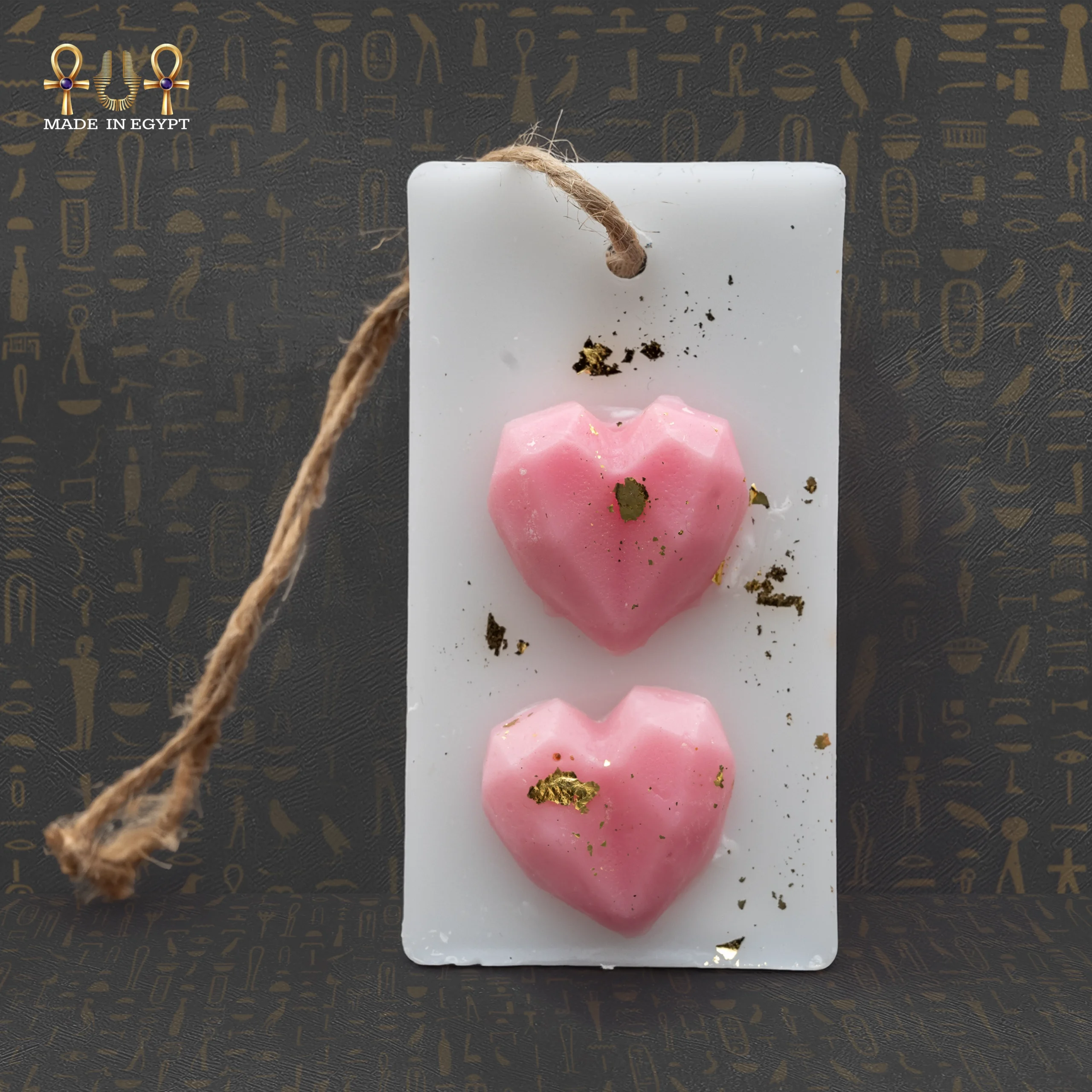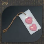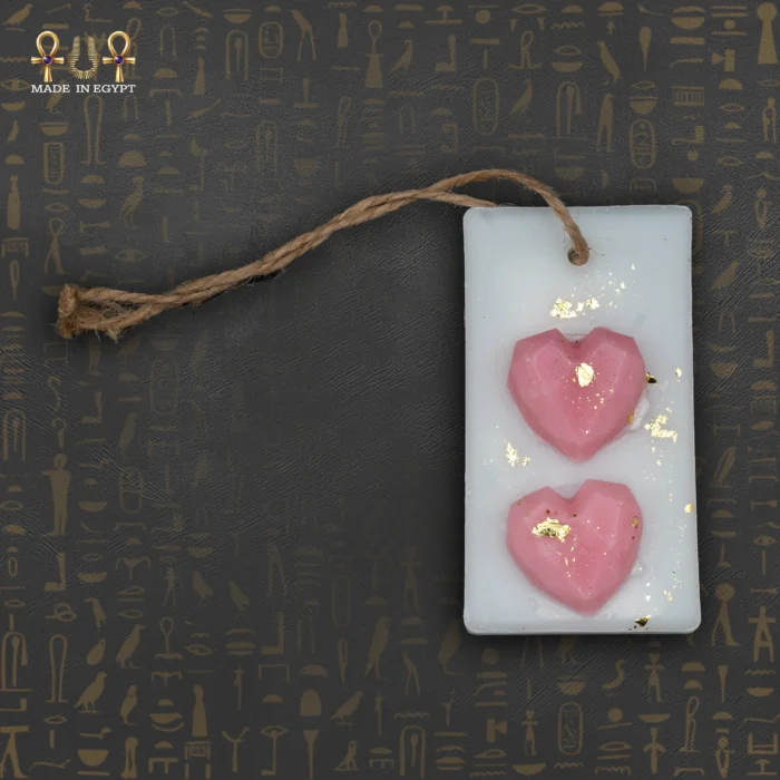 The freshener features two geometric pink hearts on the surface, giving the piece a modern yet romantic look. Soft gold-leaf accents make the design feel luxurious without overwhelming the eyes. A strong rustic jute string allows you to hang the freshener anywhere with ease—inside closets, in the car, near the vanity, or in the bathroom. Its lightweight form makes it practical and decorative at the same time.