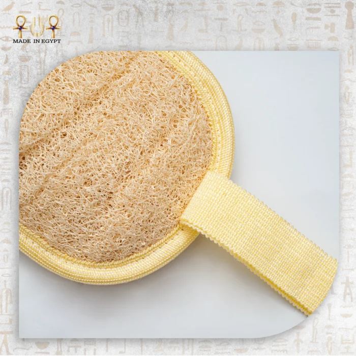 The luffa core is framed with a strong yellow-stitched border that keeps it firm during use. Its natural beige tone highlights the purity of the material and reflects the craftsmanship behind traditional Egyptian loofah production.