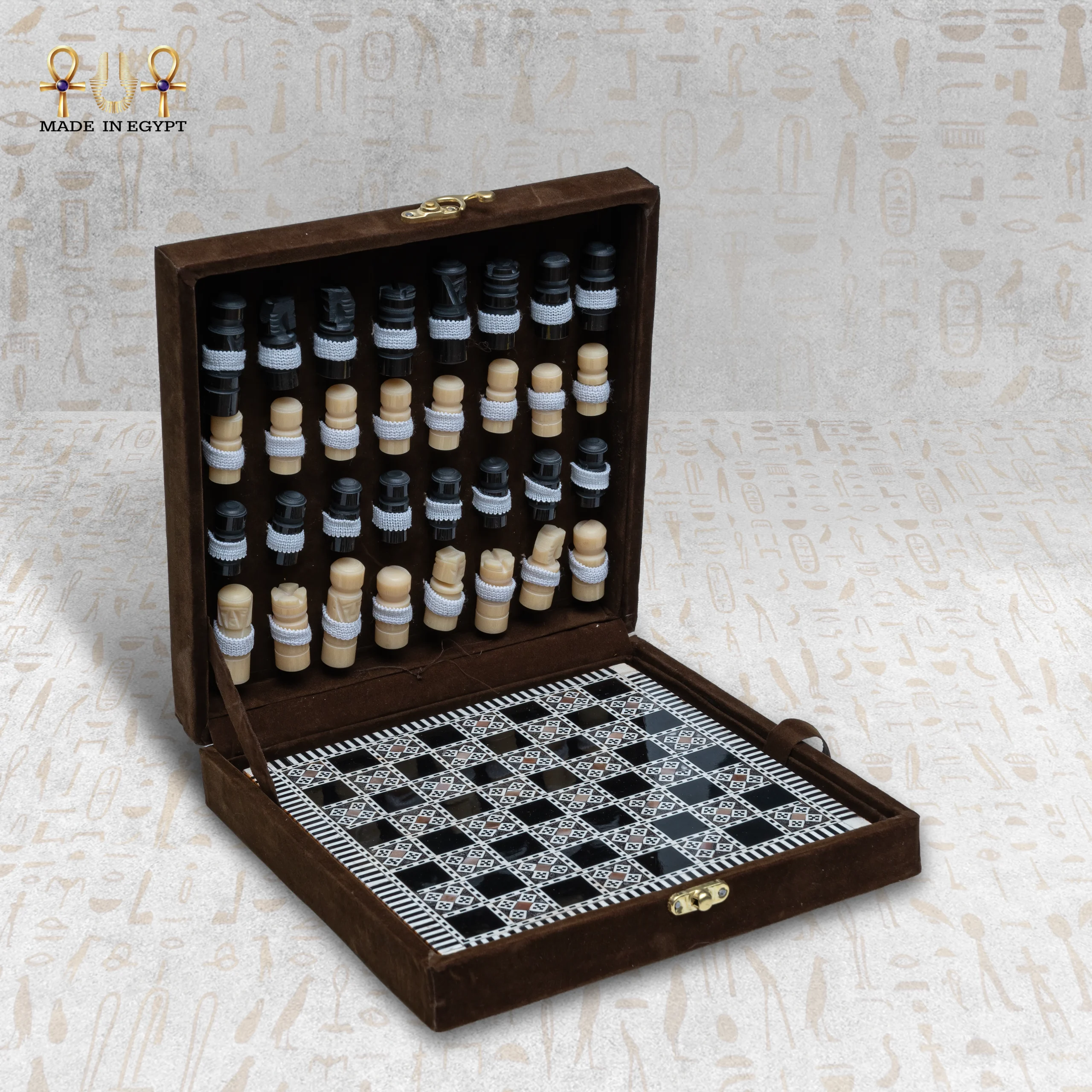 A premium chess set presented in a velvet case, featuring a handcrafted mosaic board and neatly arranged wooden pieces. A functional yet artistic set perfect for gifting or daily play.