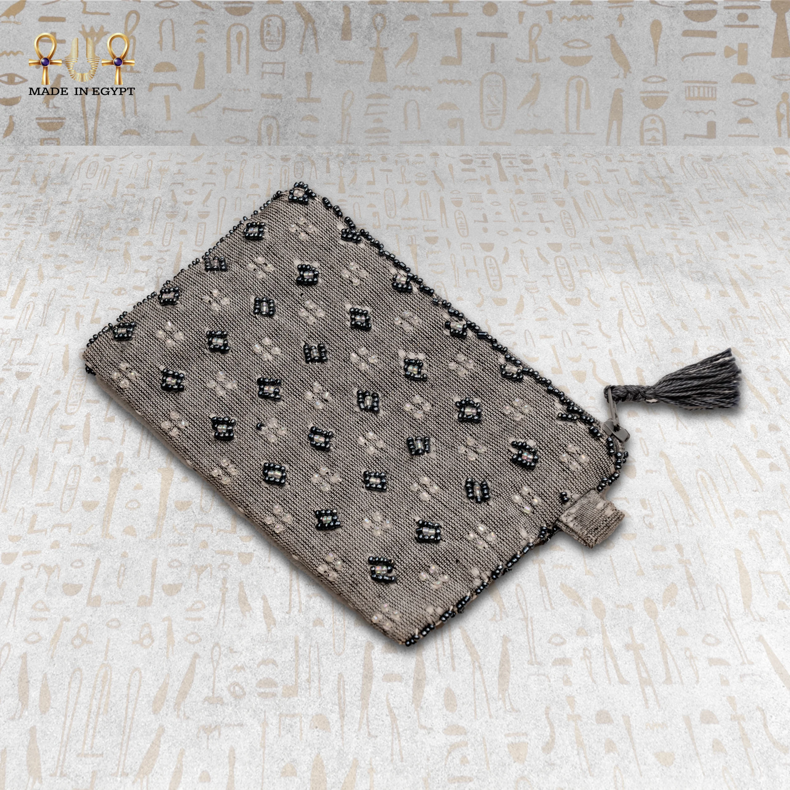 Handwoven Luxury Surprise clutch featuring delicate black and white beaded floral patterns with a tassel zipper closure.