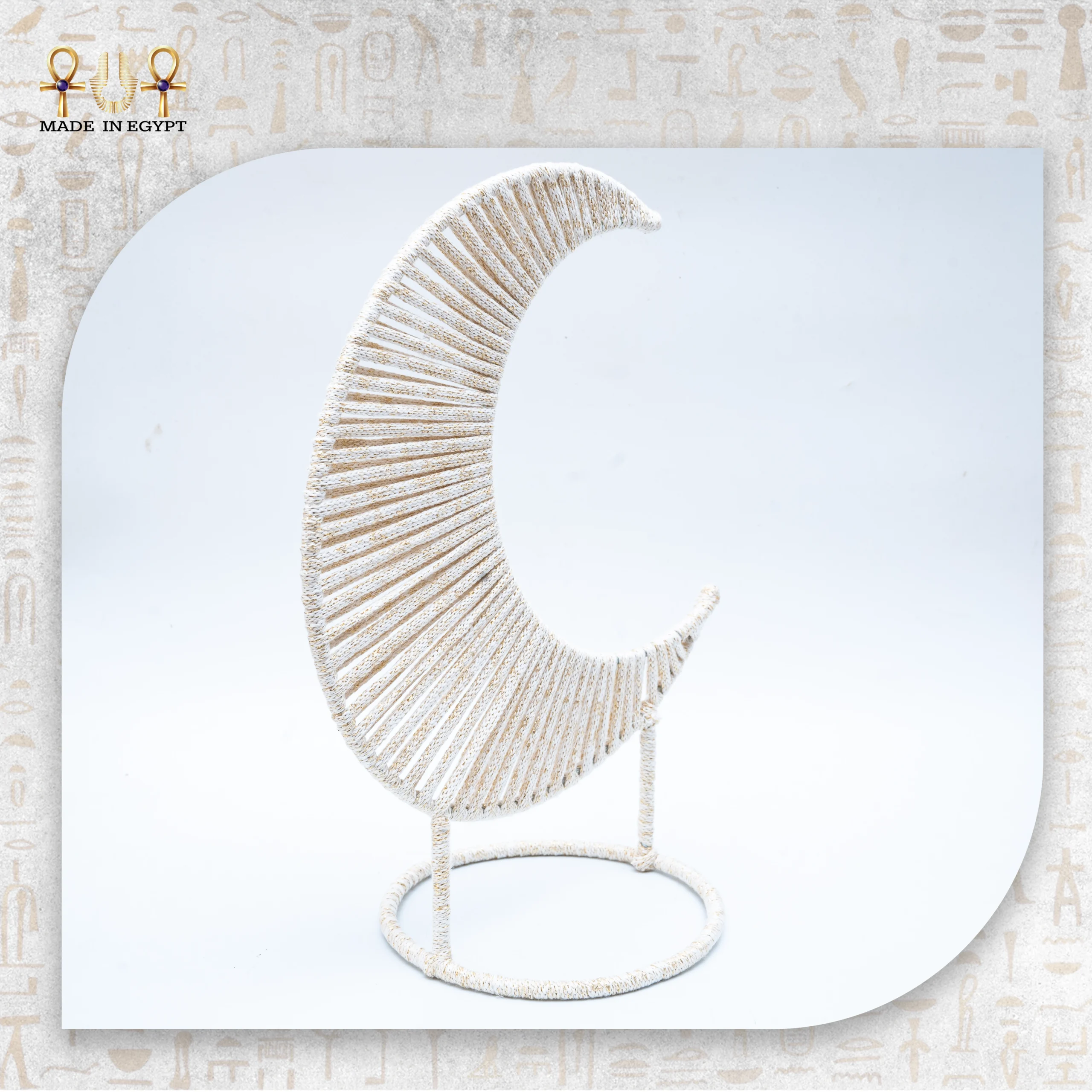 Its soft off-white/beige tone lets it blend seamlessly with modern, minimalist, Scandinavian, and festive interior styles. Supported by a simple circular metal base, the crescent maintains stability while offering a clean and elegant look. This décor piece looks beautiful on side tables, consoles, shelves, or decorative corners, making it a versatile addition to any room.