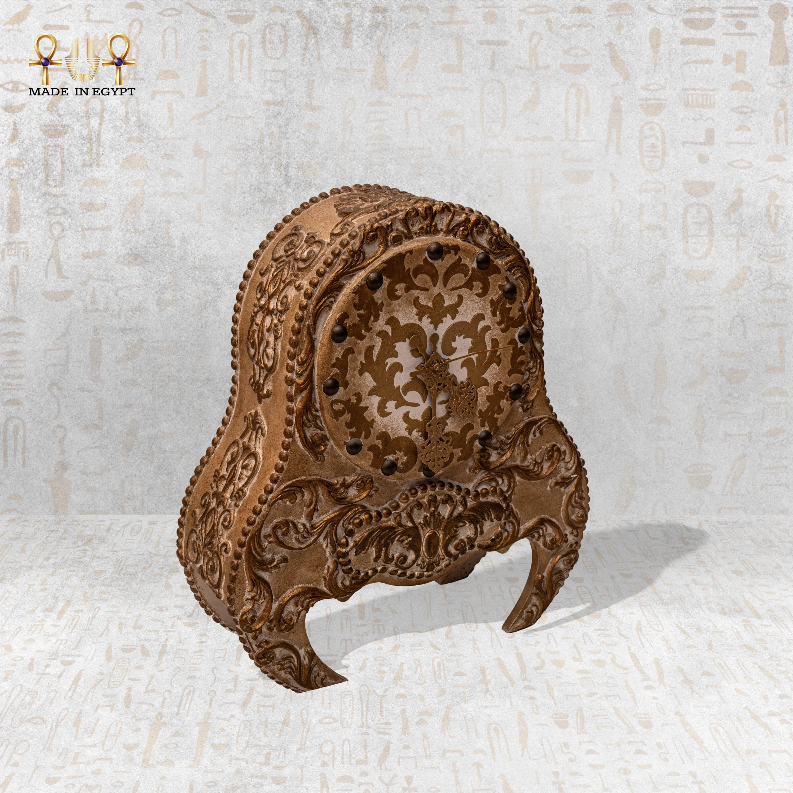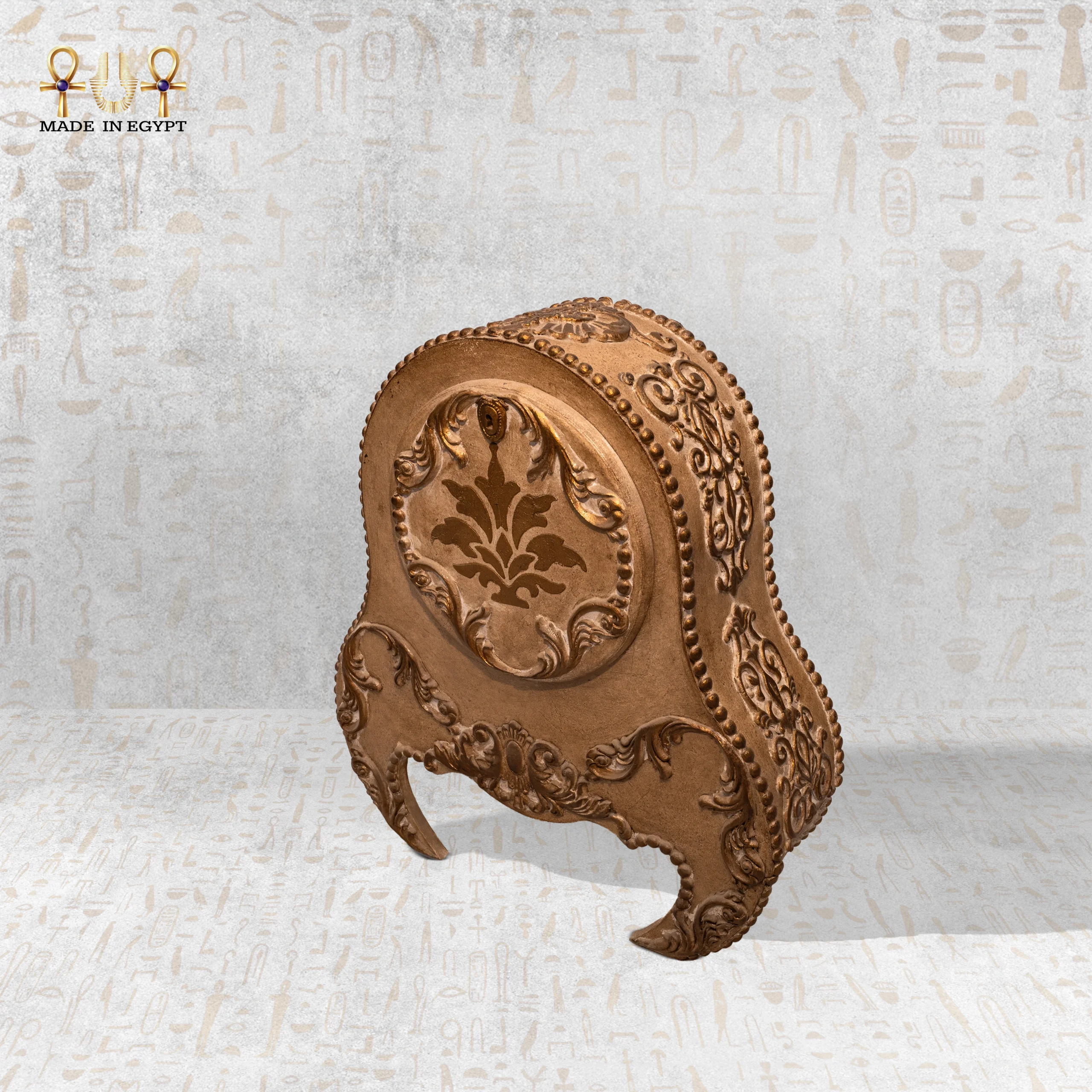 Every part of Majestic Hour radiates excellence. The golden-bronze surface shines with intricate carvings and elegant floral motifs. Its delicate patterns curve like living vines, forming a graceful visual rhythm. The sculpted clock face features symmetrical engravings that capture timeless charm, while the refined hands glide smoothly, echoing antique palace clocks once admired by royalty. Egyptian artisans have poured generations of skill and passion into this creation, blending tradition with modern sophistication.