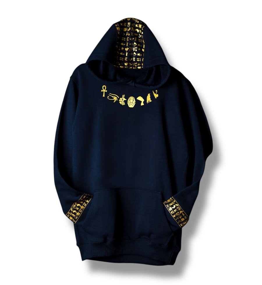 The Man Printed Pocket Hoodie brings ancient Egyptian culture to life with a bold, modern design. Featuring intricate Pharaonic symbols elegantly printed around the neckline, this hoodie adds a luxurious touch of heritage while maintaining a sleek, contemporary look. Perfect for those who appreciate cultural significance and unique fashion, this hoodie makes a distinctive statement.