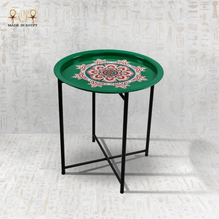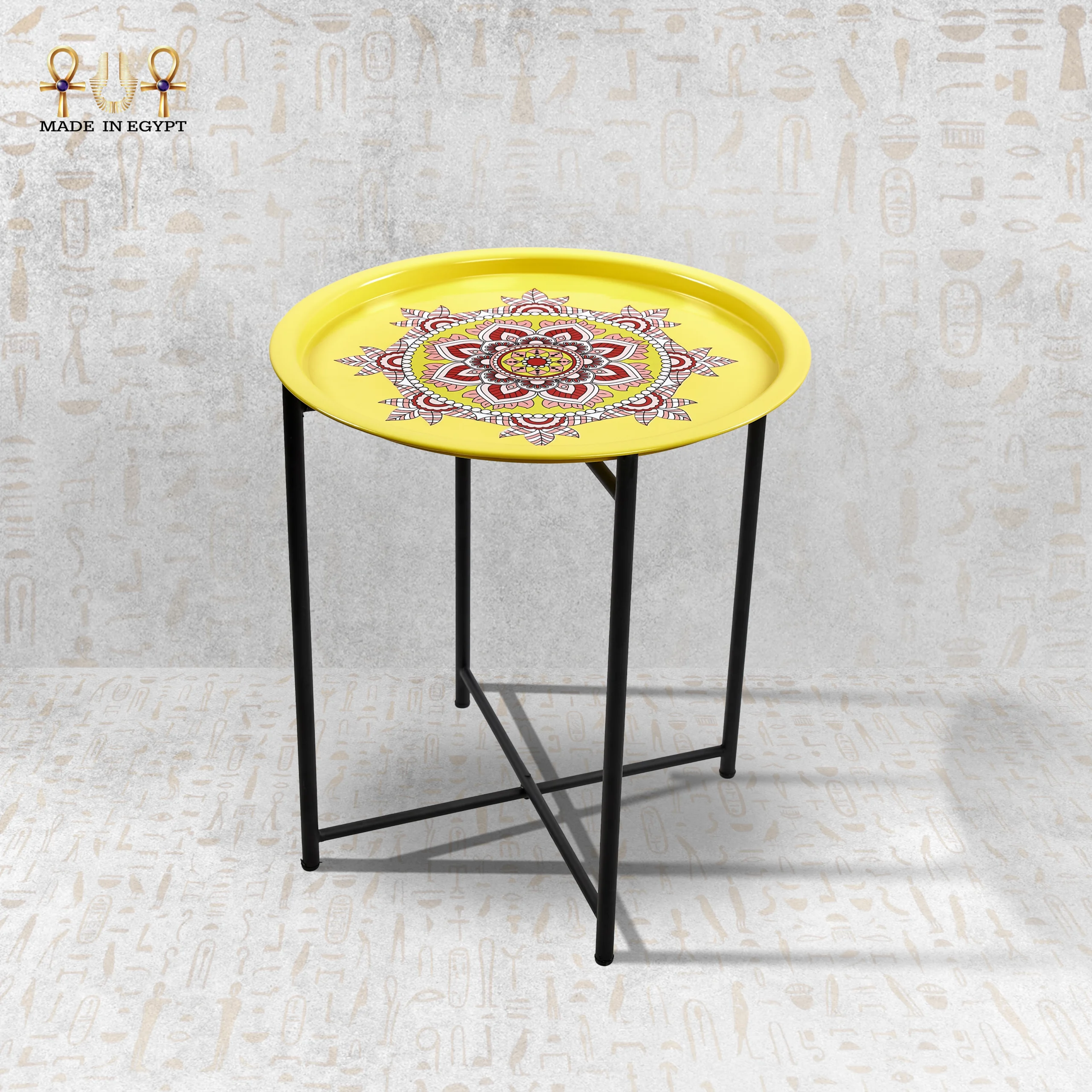 It features a round metal tray printed with a symbolic Mandala artwork, placed on a sturdy steel stand.