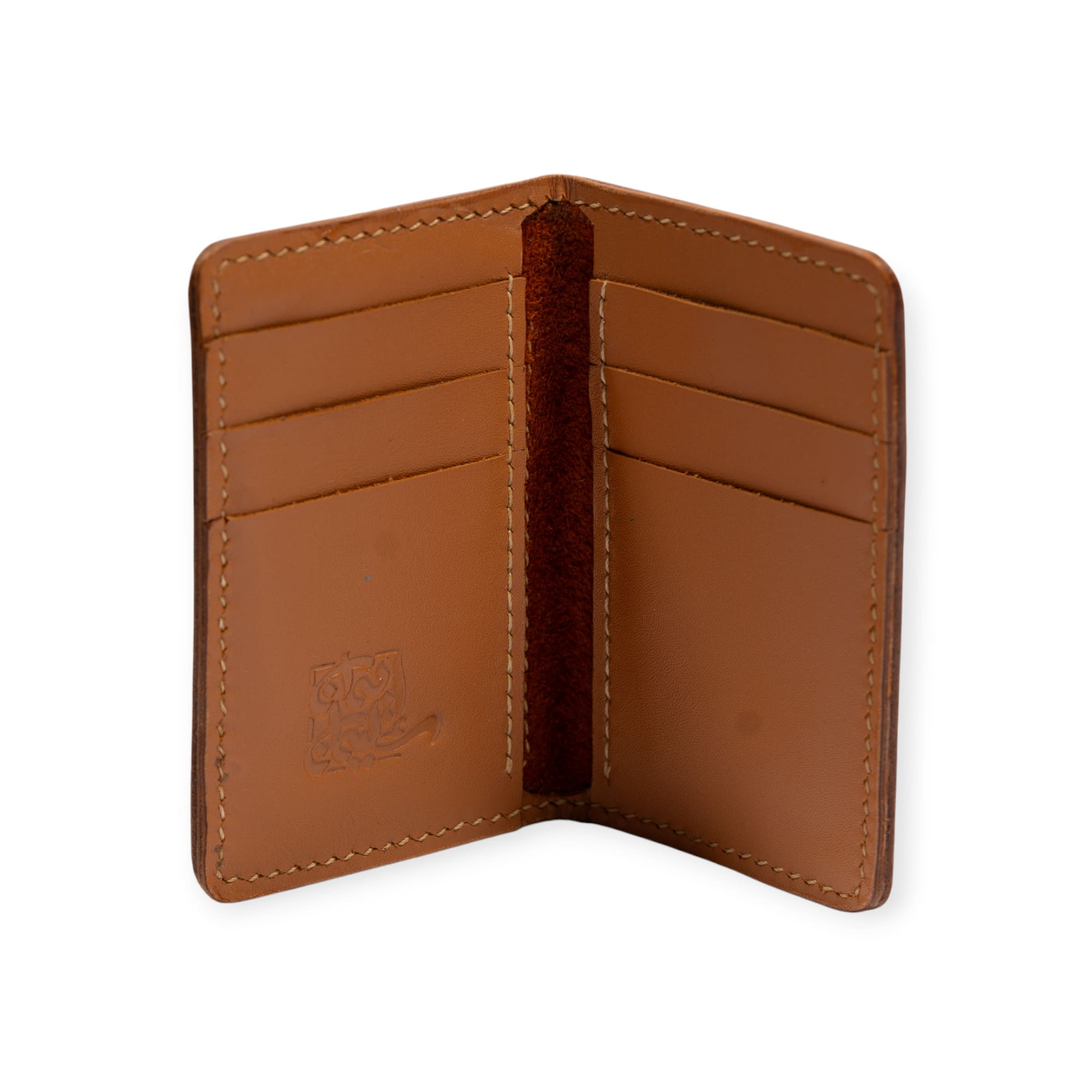 Open view of a small Havana brown leather card holder with six card slots and visible stitching.
