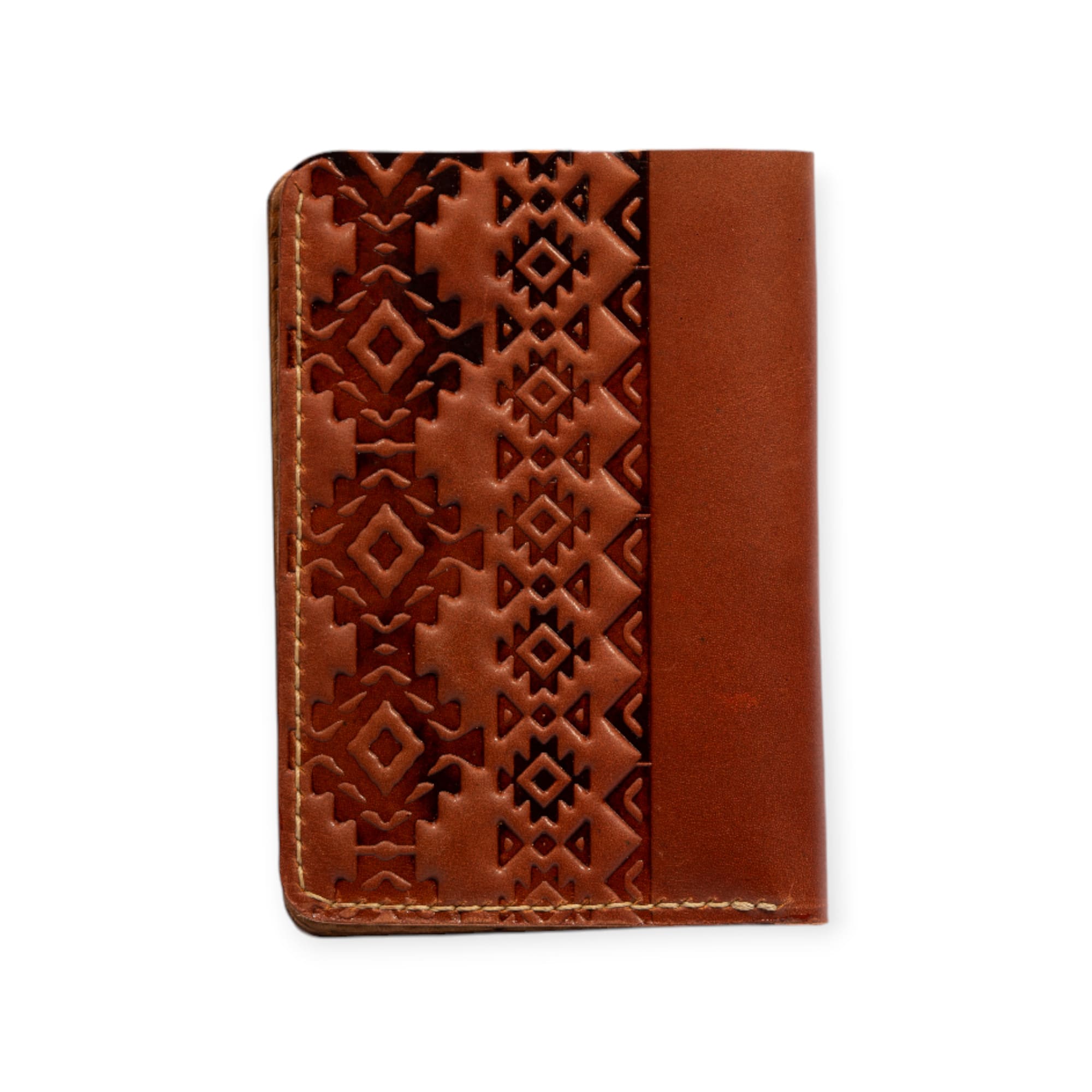 Havana leather Mega Card closed, Holder with embossed geometric pattern and contrast stitching.