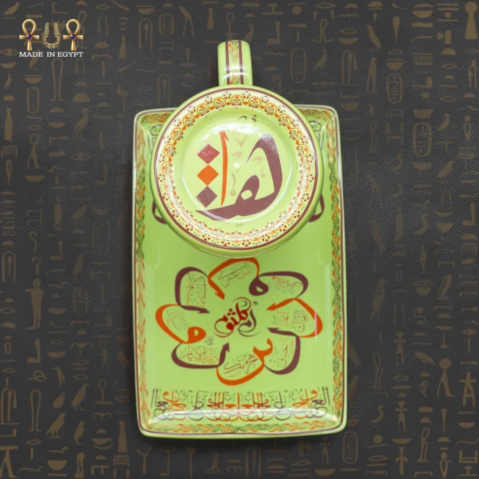 The bright green color of the mug symbolizes optimism, freshness, and energy, making it ideal for any occasion. In addition, the intricate Arabic script and decorative motifs reflect the rich tradition of Arabic music while adding a colorful artistic touch to your space. Every detail on this mug and plate is carefully crafted, turning daily use into an aesthetic experience.