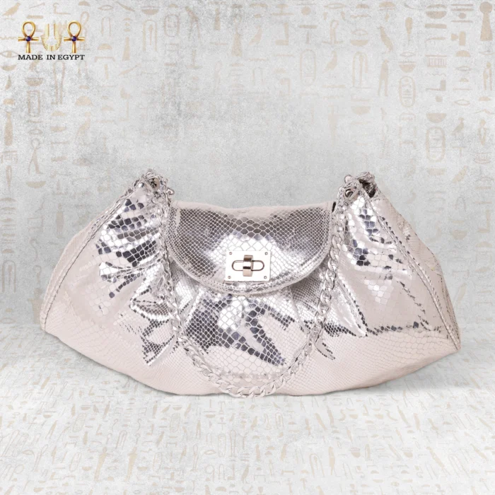 The **MIDNIGHT SERPENT** handbag combines modern design with refined elegance. Crafted from genuine cowhide with a glossy snake-skin texture, it features a practical size and a crescent shape. The gold-tone chain handle, resistant to rust, adds a touch of luxury and functionality. Perfect for both formal events and everyday use.