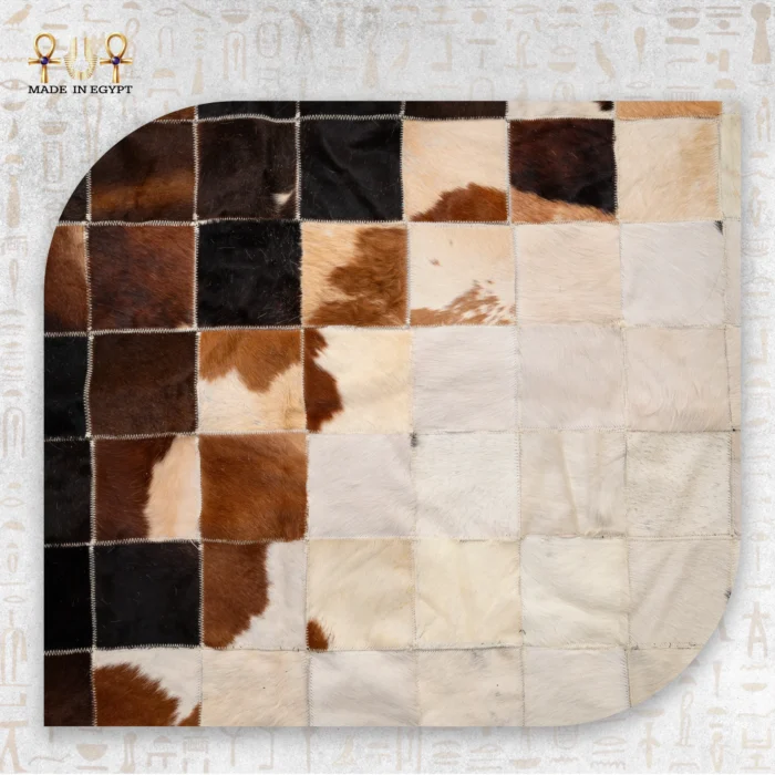 The rug features a carefully designed patchwork layout made of hand-selected cowhide squares. Each square displays rich brown tones, deep blacks, creamy off-whites, and soft beige shades. Because natural cowhide varies in pattern and color, every rug is completely unique—no two pieces are ever the same.