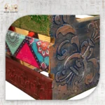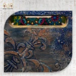 Each Mosaic Box is crafted from natural wood and hand-finished using coloring and distressing techniques that achieve a warm vintage texture. The exterior displays geometric mosaic patterns inspired by Islamic and Egyptian architecture, enriched with metallic tones of navy blue, copper, and gold. Inside, vivid hand-painted motifs in emerald green, burgundy, and royal blue add contrast and life. As a result, the box glows with color and depth, evoking the spirit of museum-quality craftsmanship.