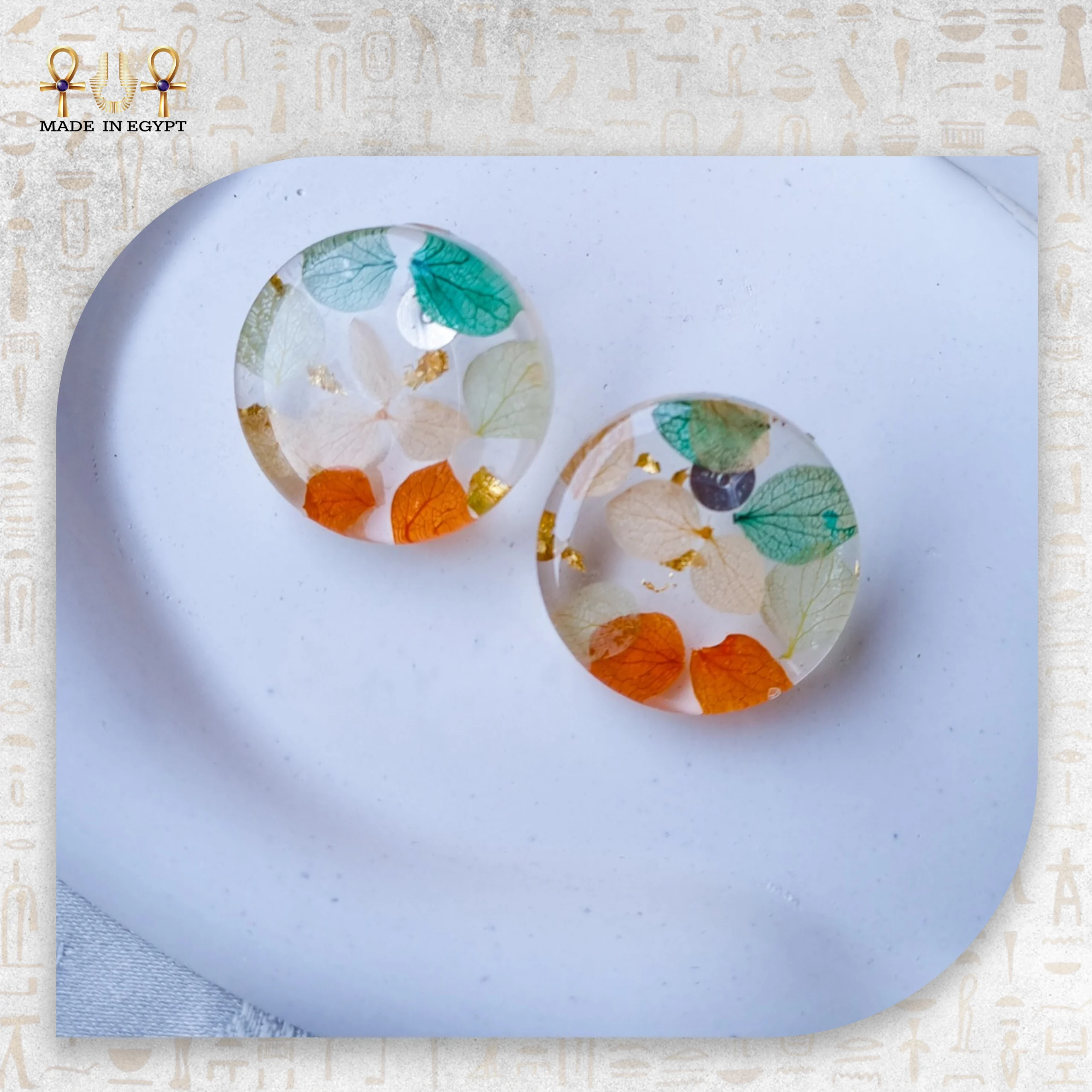 Each pair is handcrafted by Egyptian artisans who pour patience and precision into every detail. The clear resin allows the natural elements inside to shine, forming a delicate balance between transparency and color. Because every flower and leaf is arranged by hand, no two pairs are ever identical. Each one carries its own story and unique natural pattern, making it a truly personal piece of wearable art.