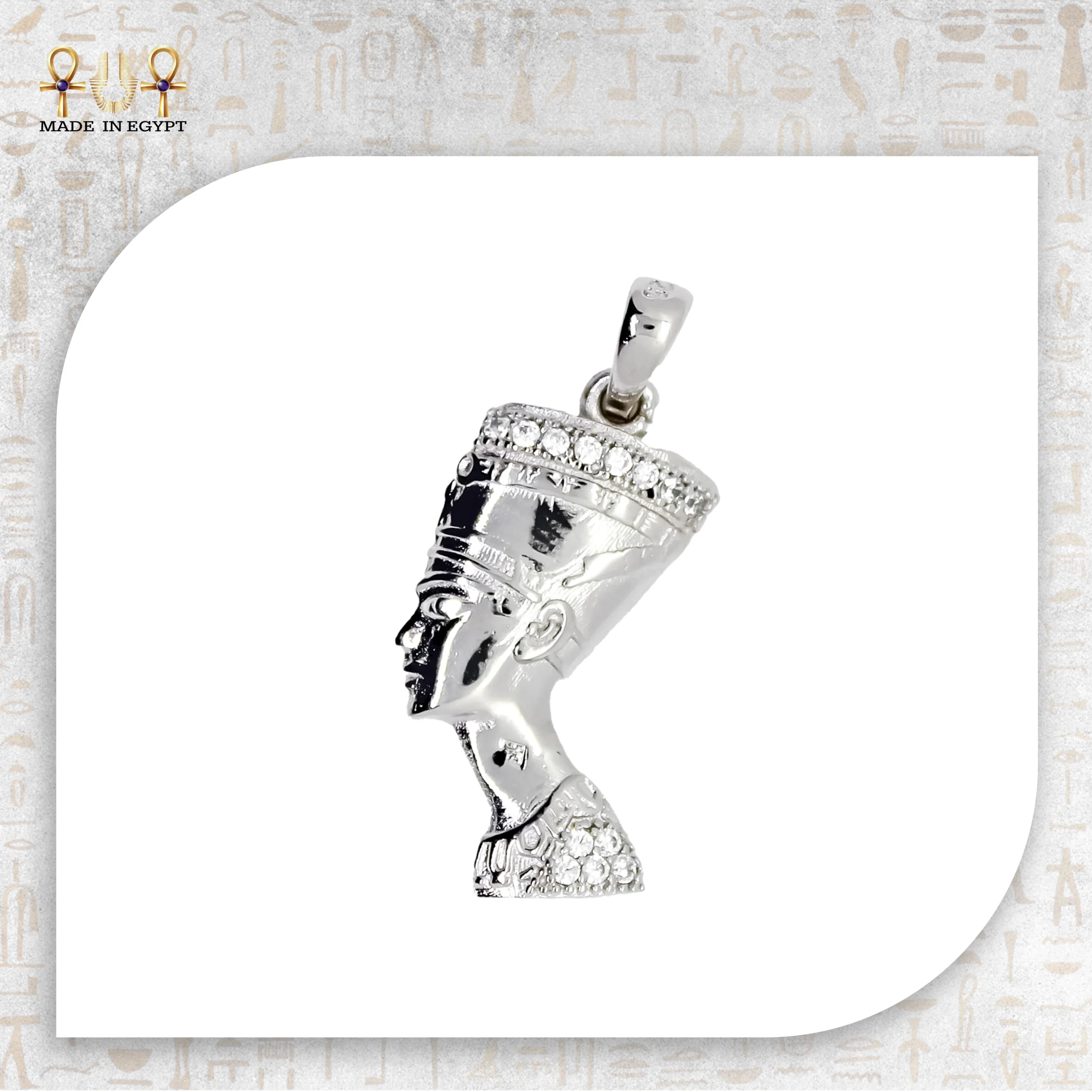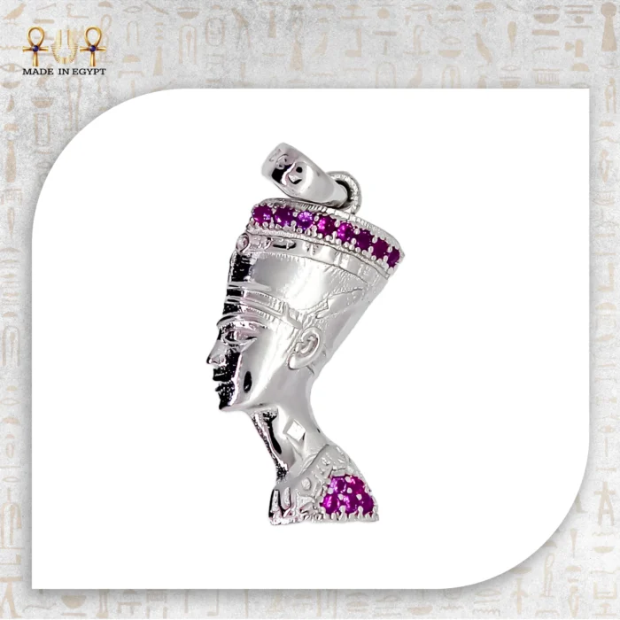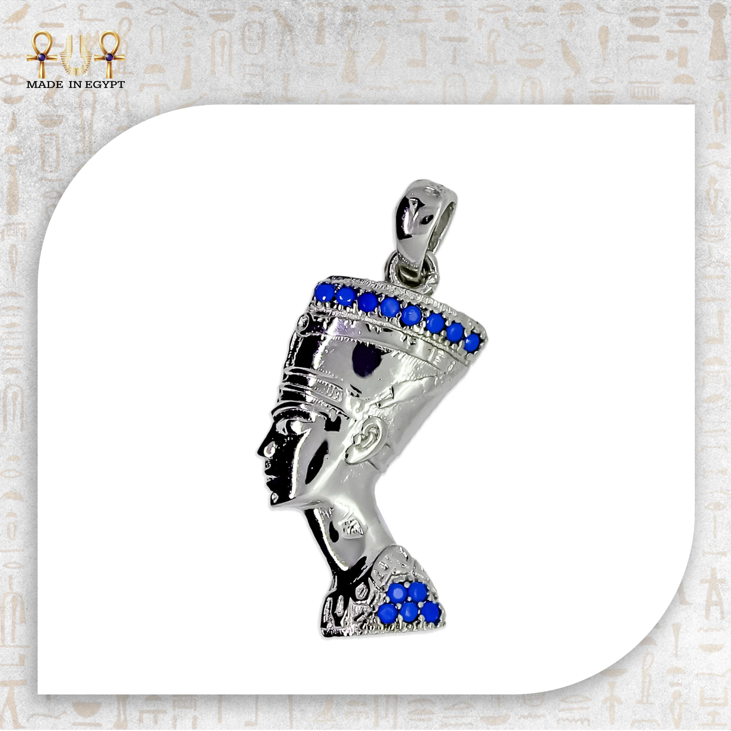 Made from premium metal with a polished silver finish, the pendant reflects both strength and sophistication. Its profile shows Queen Nefertiti wearing her detailed crown, a symbol of royalty and power. Blue stones decorate the crown, giving it a bold and vibrant touch. These stones recall the beauty of Egyptian turquoise, known for symbolizing purity, protection, and higher energy.