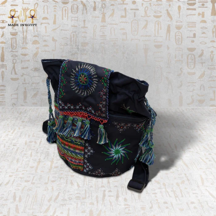 The Night Delight bag blends authentic craftsmanship with innovative design, reflecting the beauty of Egyptian heritage and the richness of traditional colors. Artisans craft it from high-quality, durable fabric in deep navy blue. This luxurious color adds elegance and highlights the vibrant embroidery, creating a harmonious and lively composition. The fabric feels soft yet strong, ensuring the bag remains stylish and durable for years.
