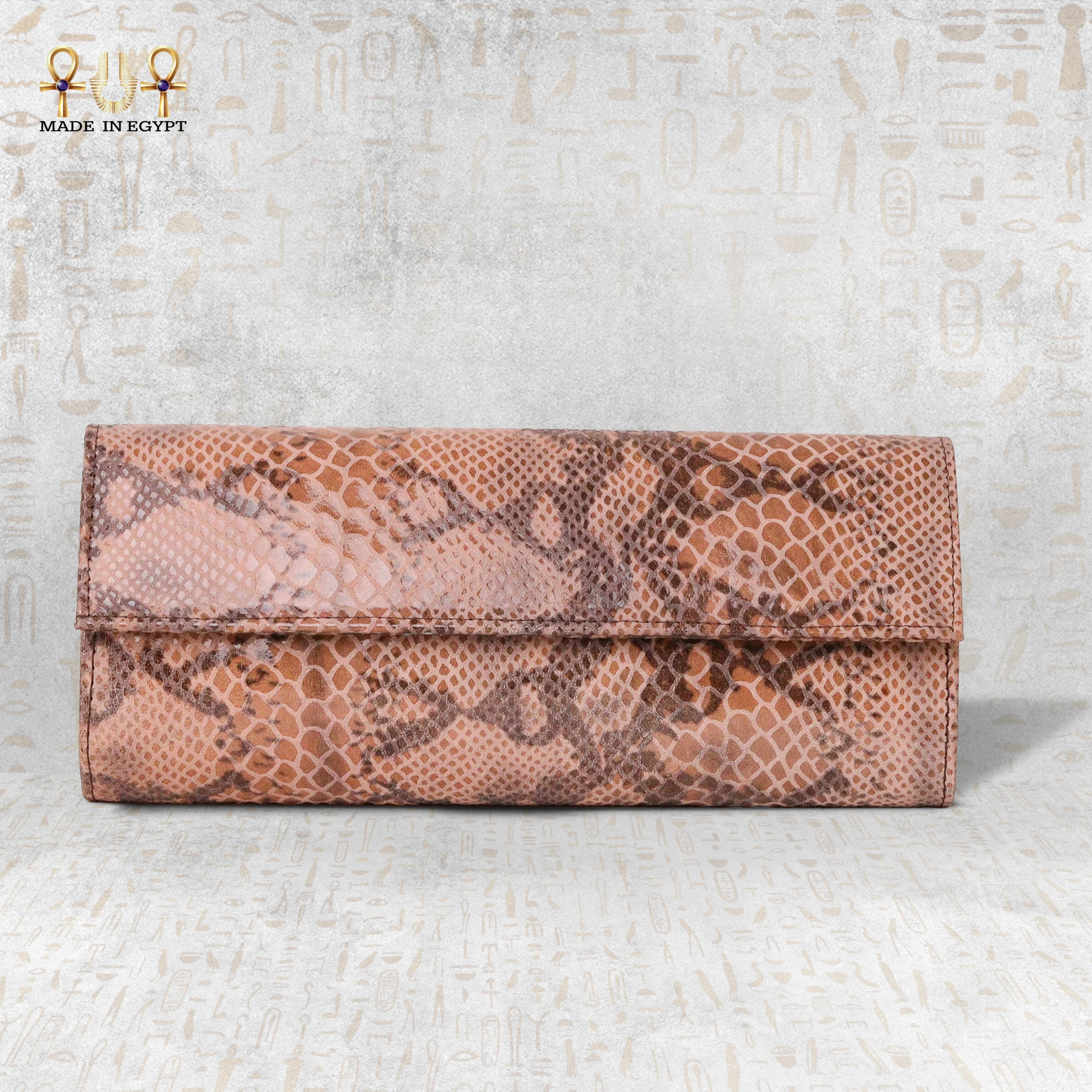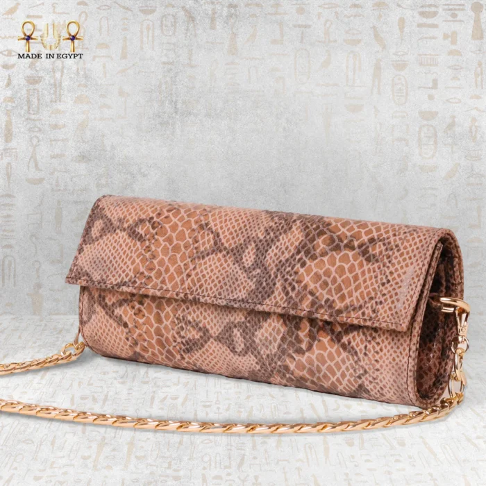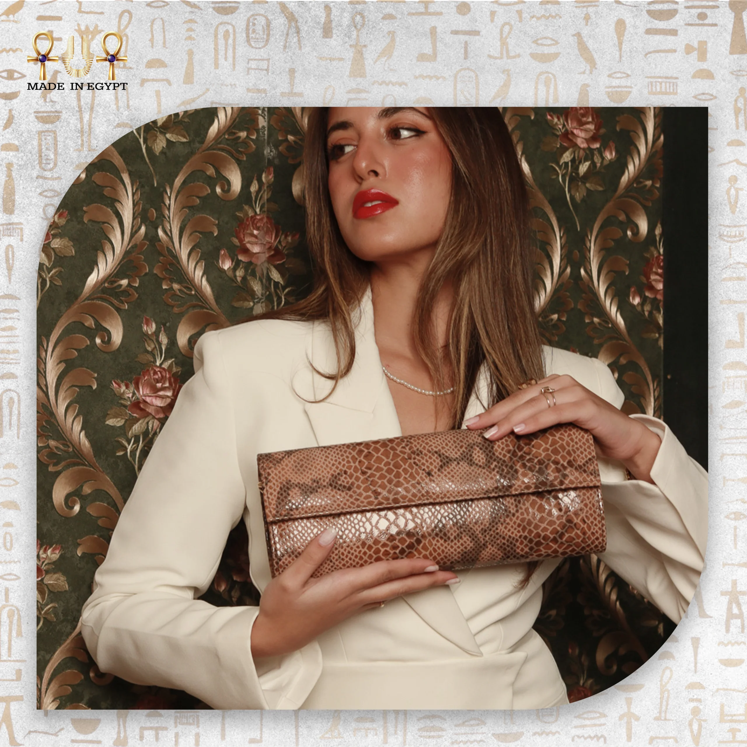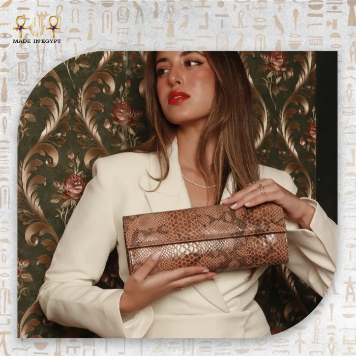 The NOURA Elite handbag is a statement of elegance, power, and individuality. Handcrafted from genuine snake-textured leather, it embodies Egyptian artistry while blending timeless charm with modern design sensibility. This bag enhances any outfit with grace and confidence, whether at a formal event or an elegant evening gathering.