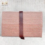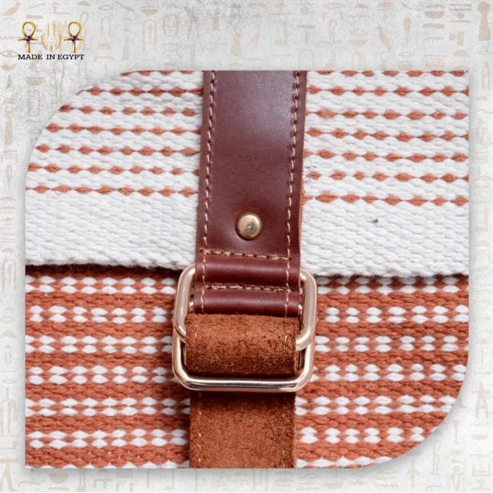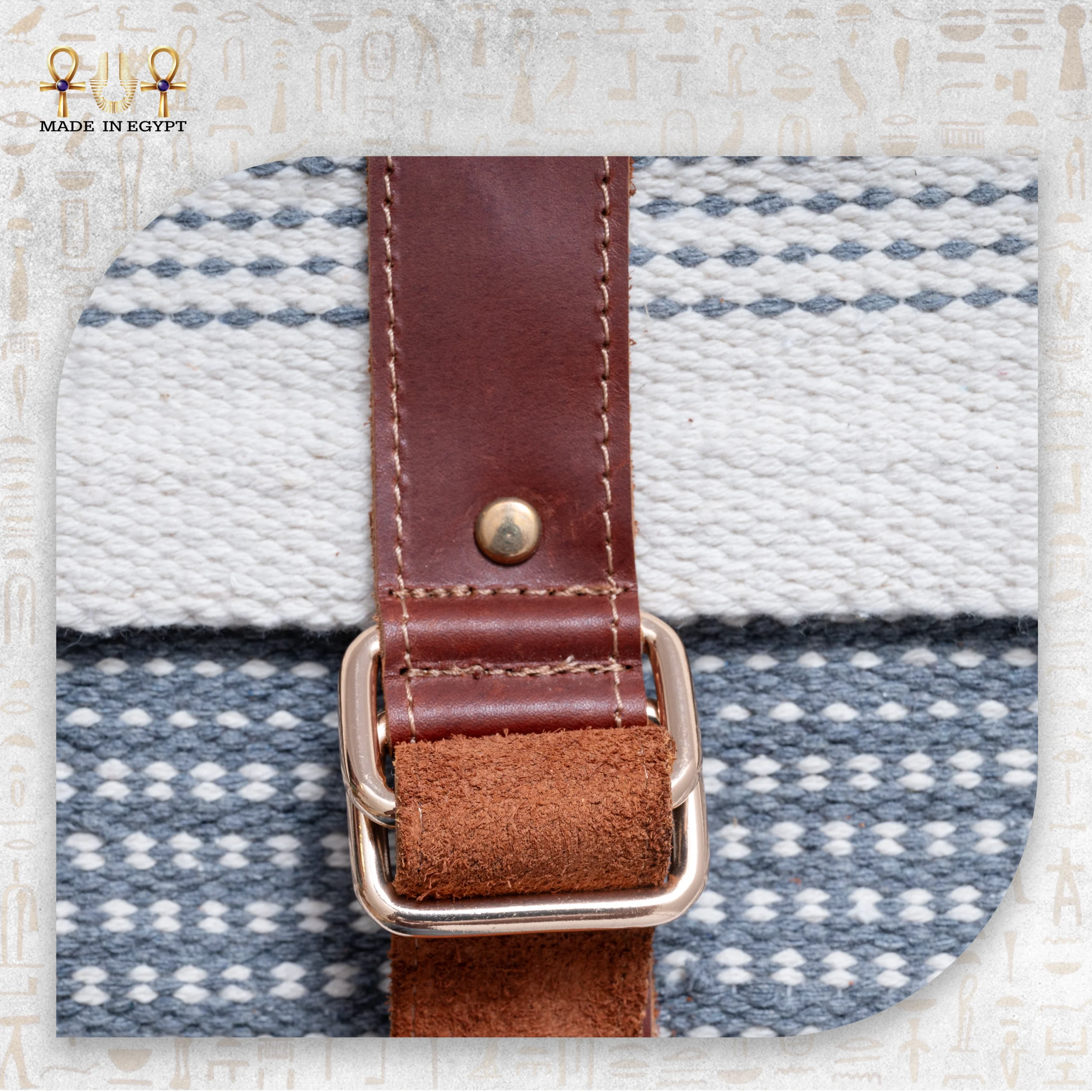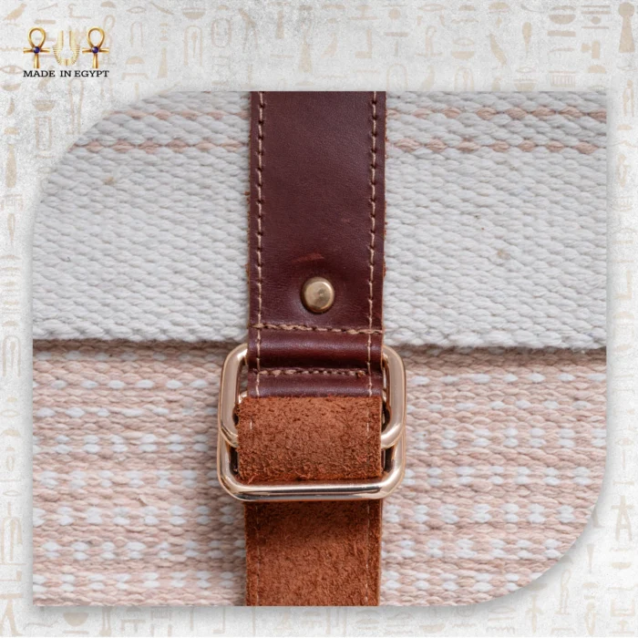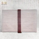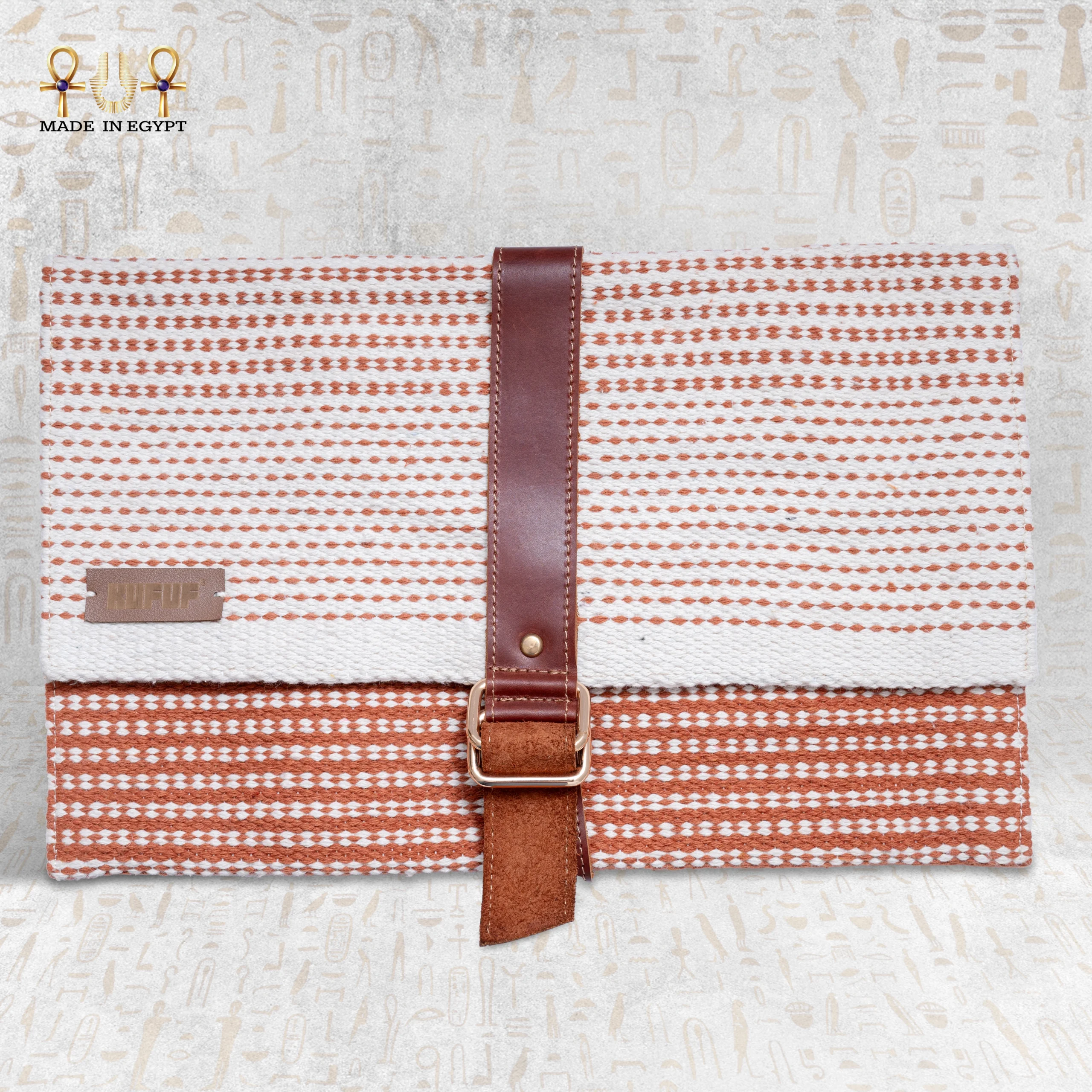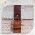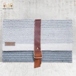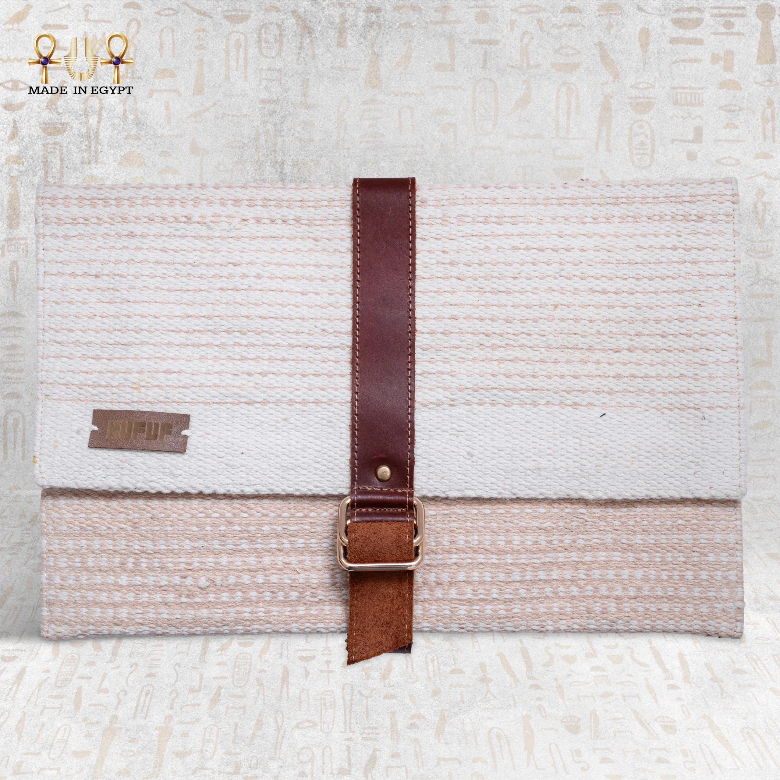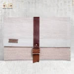 A deep brown leather strap runs through the center of the clutch, symbolizing strength and connection. The golden metal buckle adds a subtle touch of luxury, enhancing the contrast between raw texture and smooth finish. In addition, its clean silhouette gives it a modern edge, while the handwoven fabric preserves its artisanal charm. Together, they form a design that feels elegant yet effortless — perfect for women who appreciate authenticity over excess.
