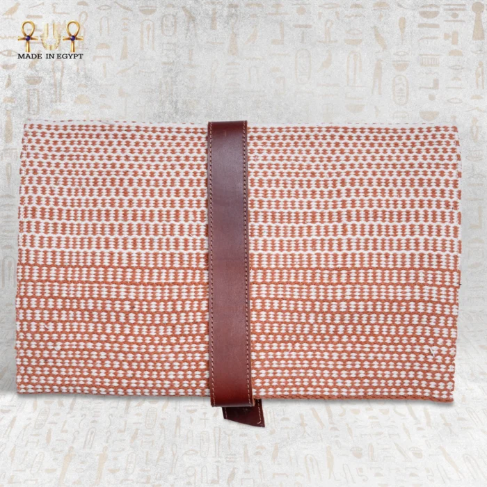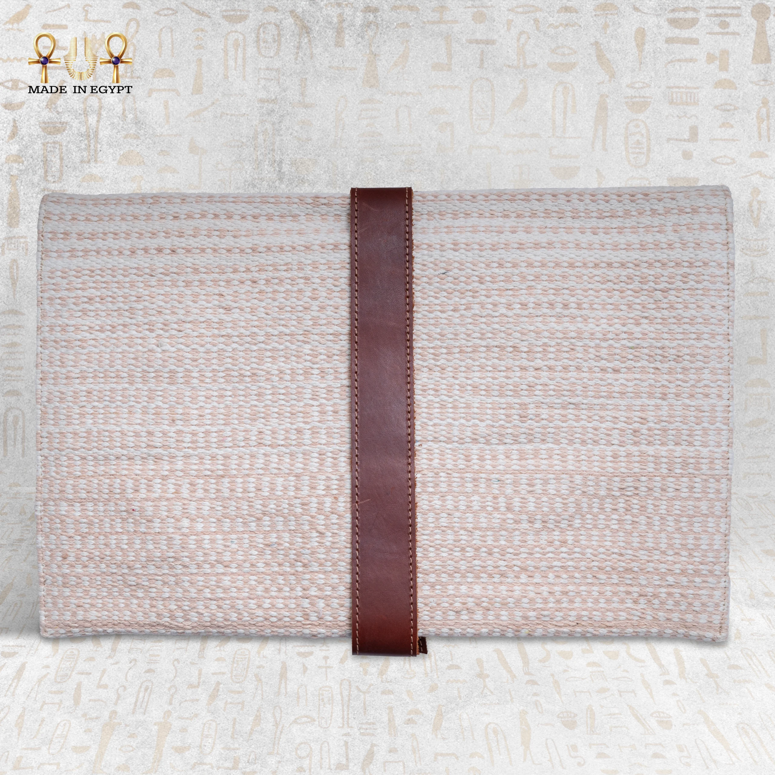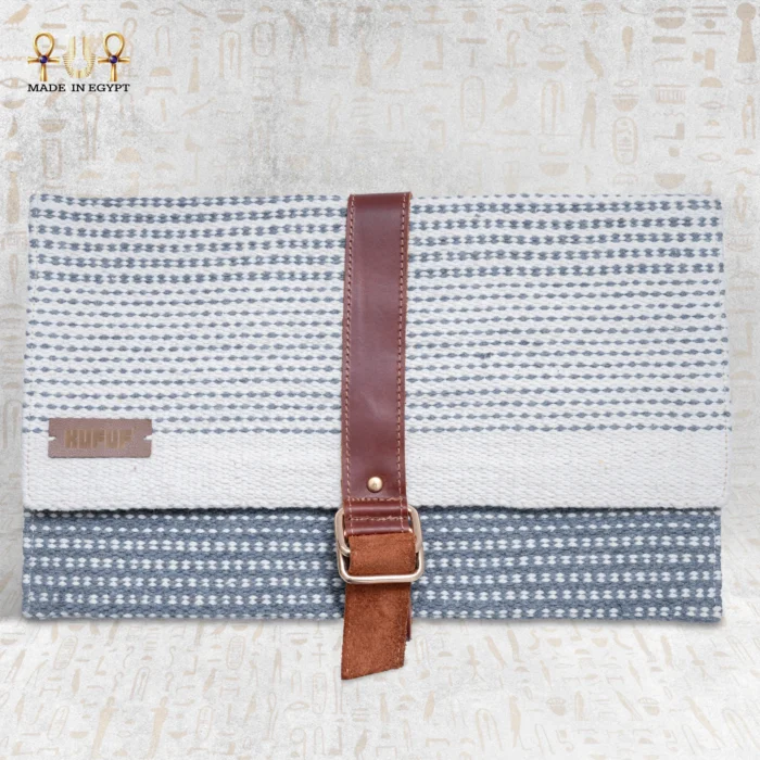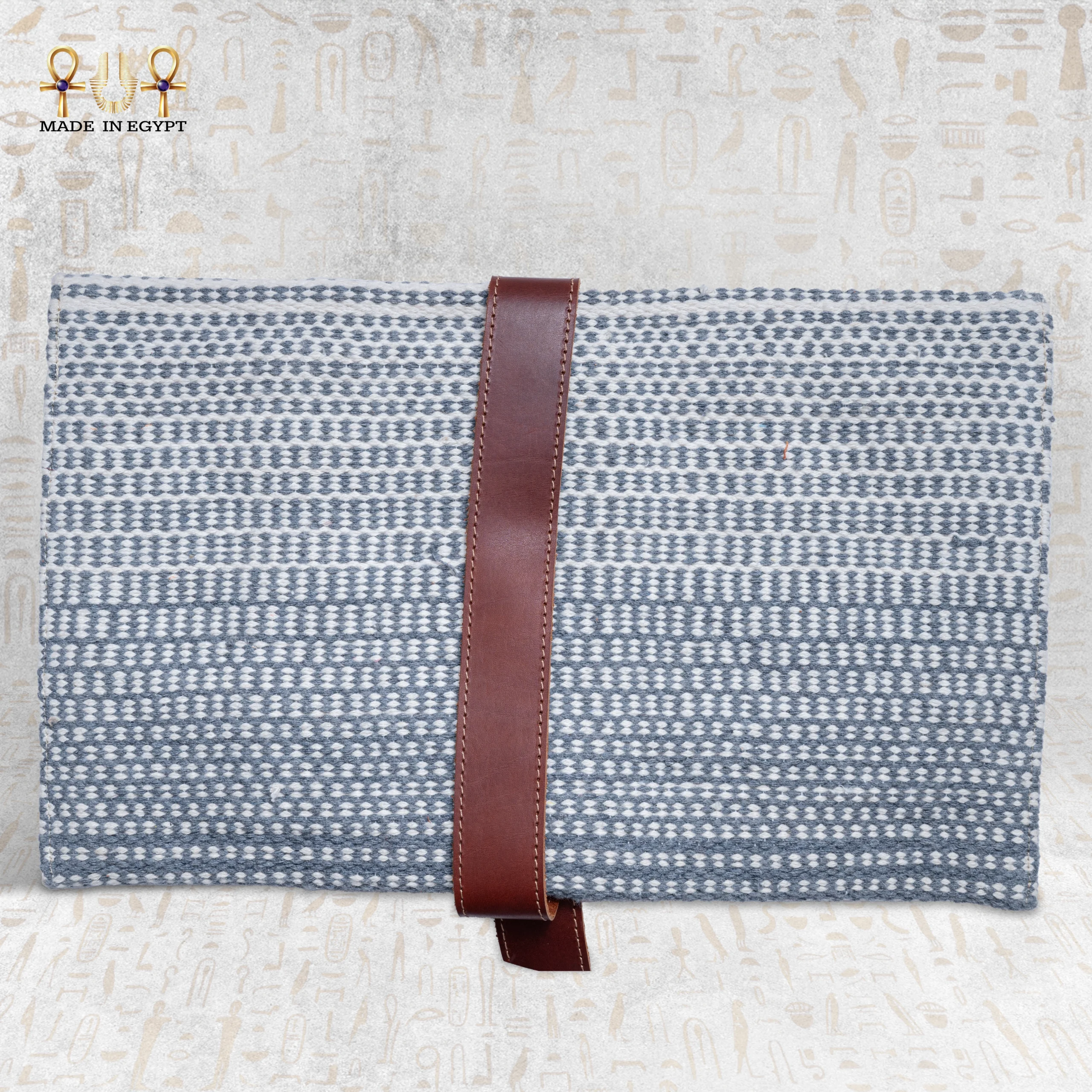Each Oasis Lines Clutch is handwoven on traditional looms inside quiet Egyptian ateliers. Skilled artisans create symmetrical lines using soft ivory threads mixed with earthy shades of sand, clay, and twilight grey. Moreover, every weave highlights the art of slow creation — a celebration of mindfulness and authenticity. The process transforms raw materials into a refined piece that feels both organic and sophisticated.