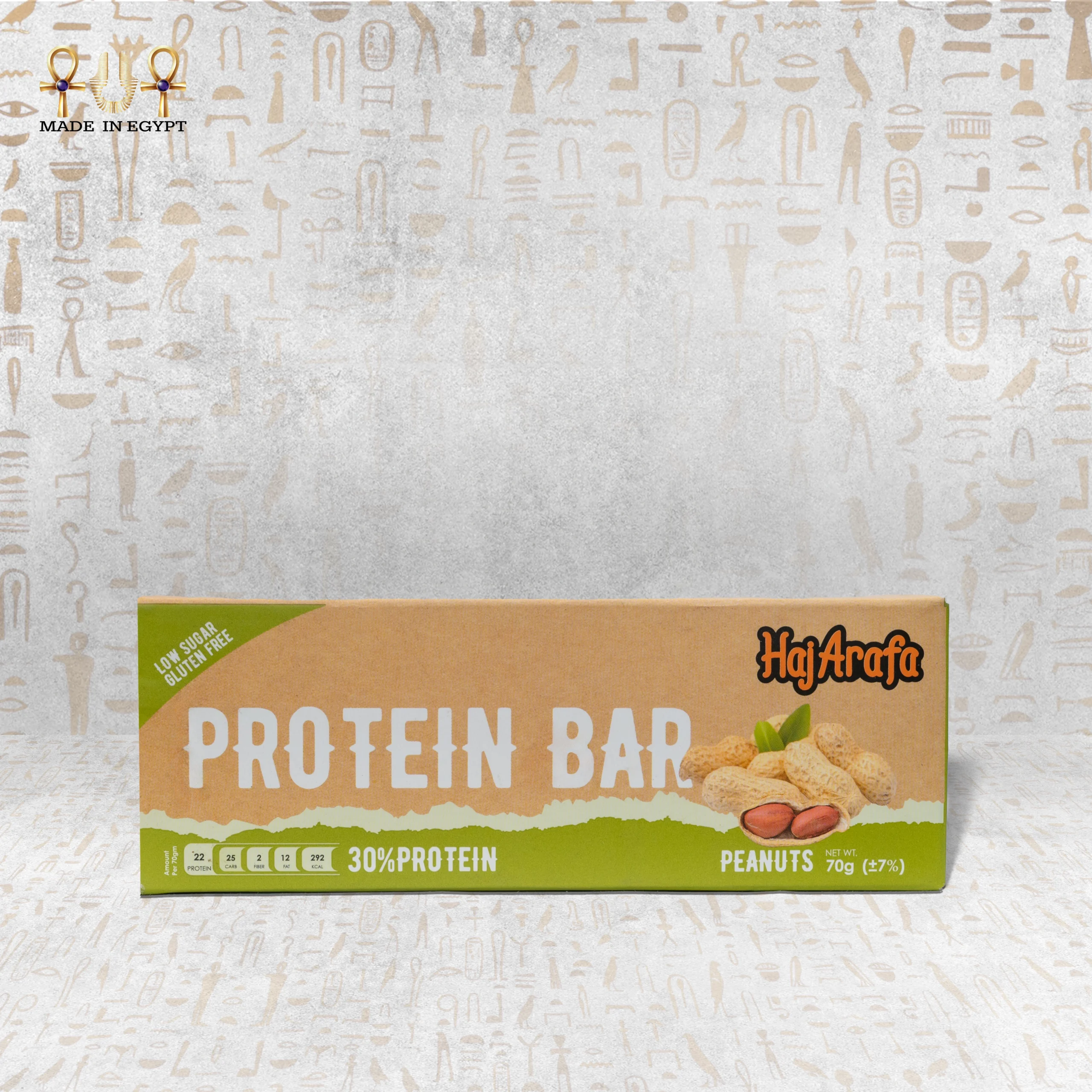 Front view of Haj Arafa Peanut Power protein bar packaging showing 30% protein label and peanut illustration.
