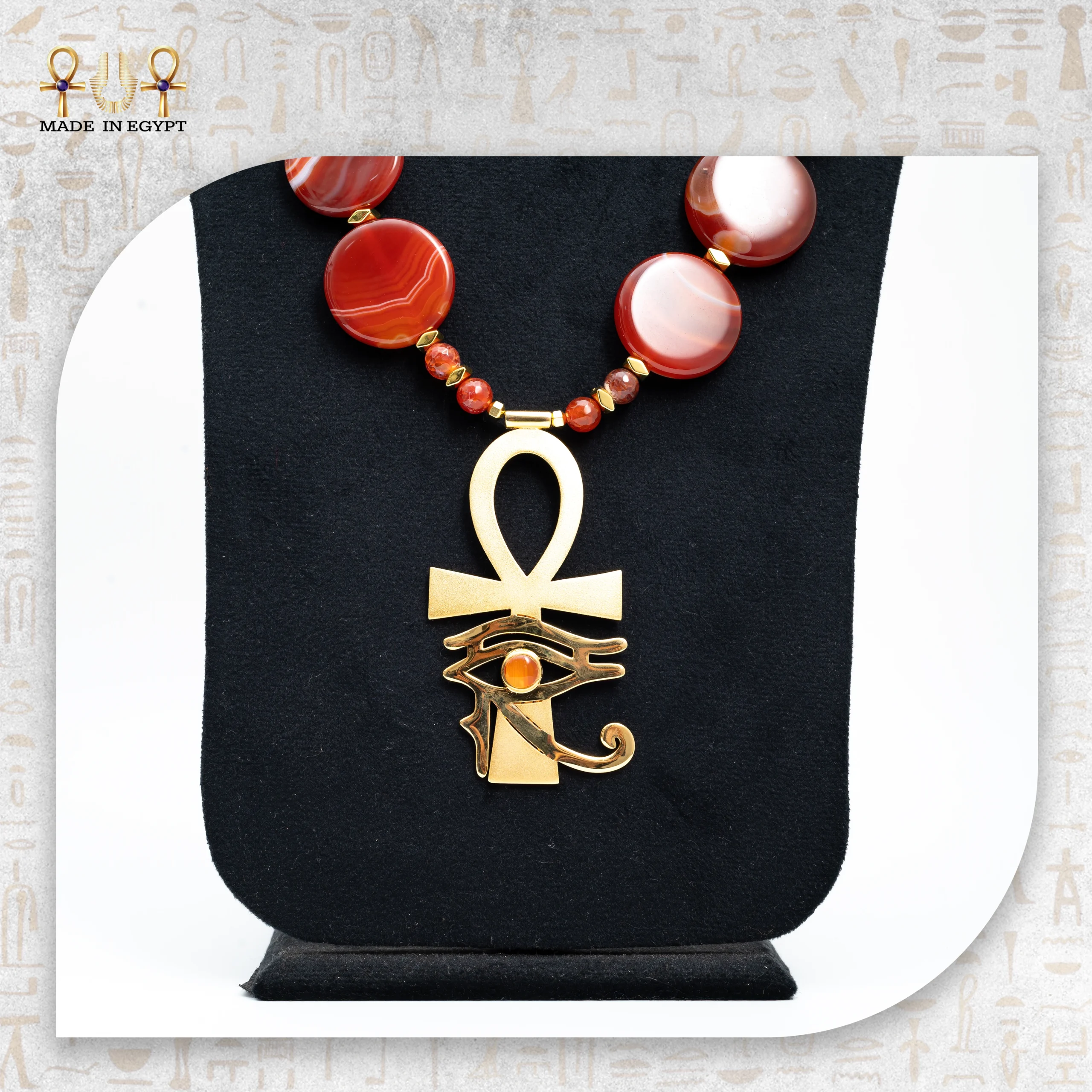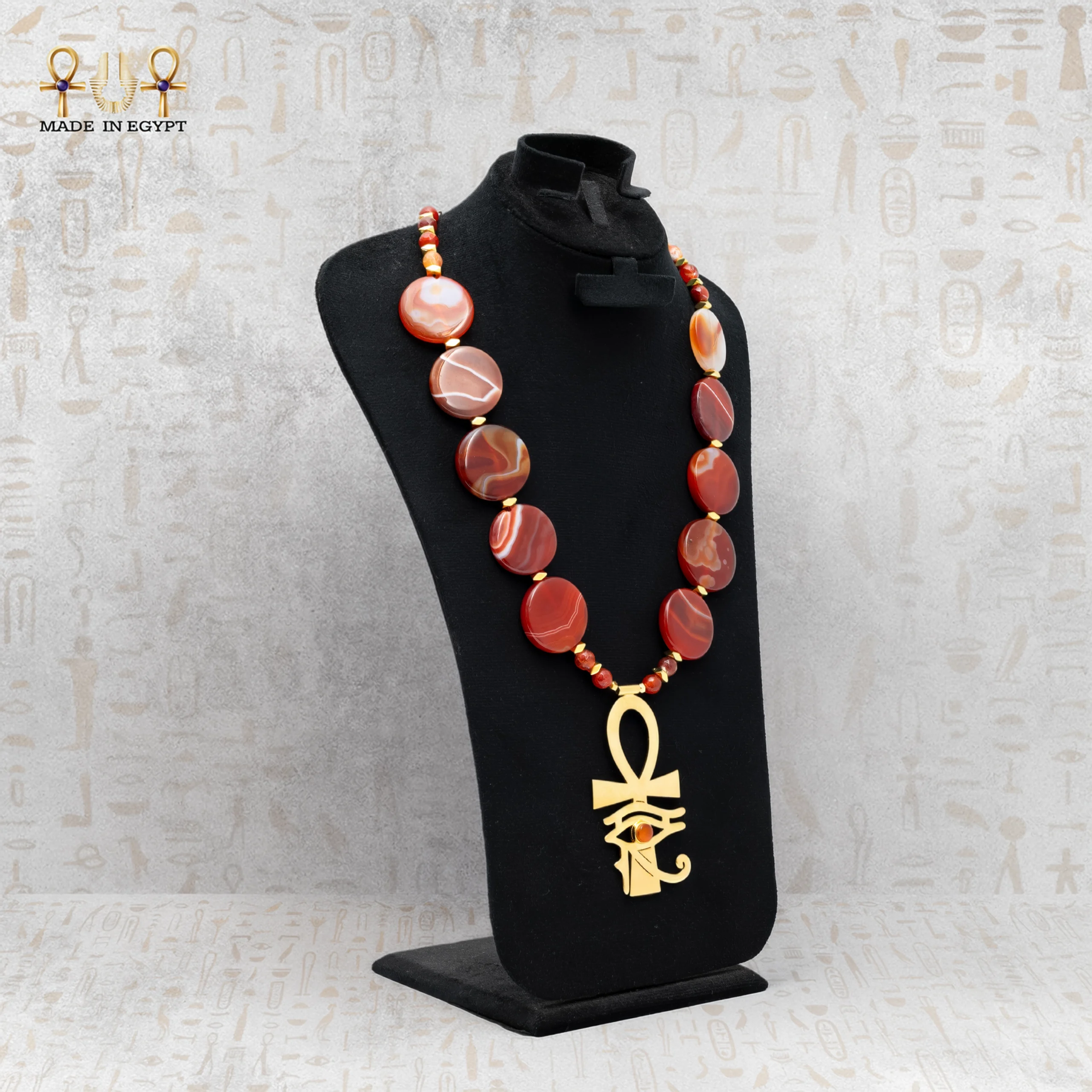 A luxurious Pharaonic-inspired necklace made with natural fiery-red agate stones and a beautifully crafted gold-plated brass Ankh pendant featuring the Eye of Horus. Designed to symbolize life, protection, strength, and royal elegance. A perfect statement piece for heritage lovers and timeless jewelry collectors.