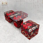 This elegant set features a tea table with a clear glass top revealing intricate geometric patterns beneath—designs inspired by pharaonic icons and Bedouin motifs. Two cube-shaped poufs complement the table, blending comfort and visual refinement. Their solid wooden bases and dense foam interiors ensure durability while maintaining a soft, inviting look.