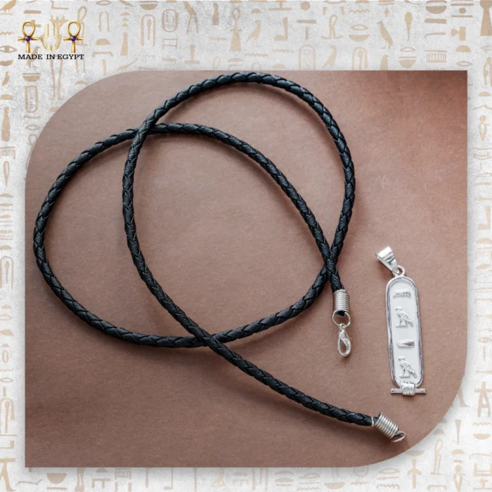 The cartouche hangs from a durable loop and is paired with a deep black braided leather cord, offering a sleek, practical look that fits seamlessly into any wardrobe. Whether worn with casual cotton shirts, formal wear, or layered with other necklaces for a trendy multi-layered effect, the Pharaohs’ Legacy Necklace adapts effortlessly to every occasion.
