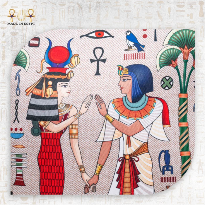 The front panel features a striking pharaonic design. A queen and pharaoh appear side by side, symbolizing love, unity, and shared strength. Traditional hieroglyphics and decorative patterns surround the scene, echoing the style of ancient temples and tombs. This design transforms the bag into a wearable piece of art.