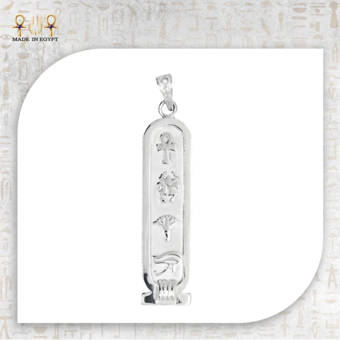 The oval frame reflects the iconic shape of royal cartouches seen in temples and tombs. Made from premium metal plated in polished silver, the pendant showcases refined engravings and fine curves. The smooth, reflective surface highlights each hieroglyph with depth and clarity.