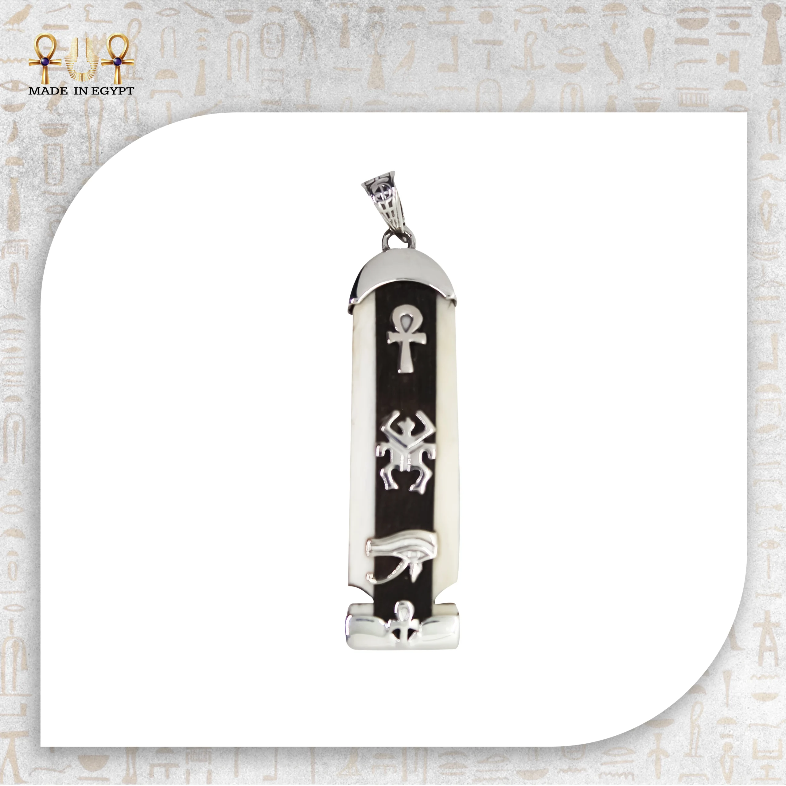 The pendant features a dark center framed by an ivory-toned border. This contrast highlights the engraved symbols and brings visual harmony to the piece. Each detail is crafted from high-quality metal plated in polished silver. The smooth contours and clean lines reflect the precision of skilled Egyptian artisans.