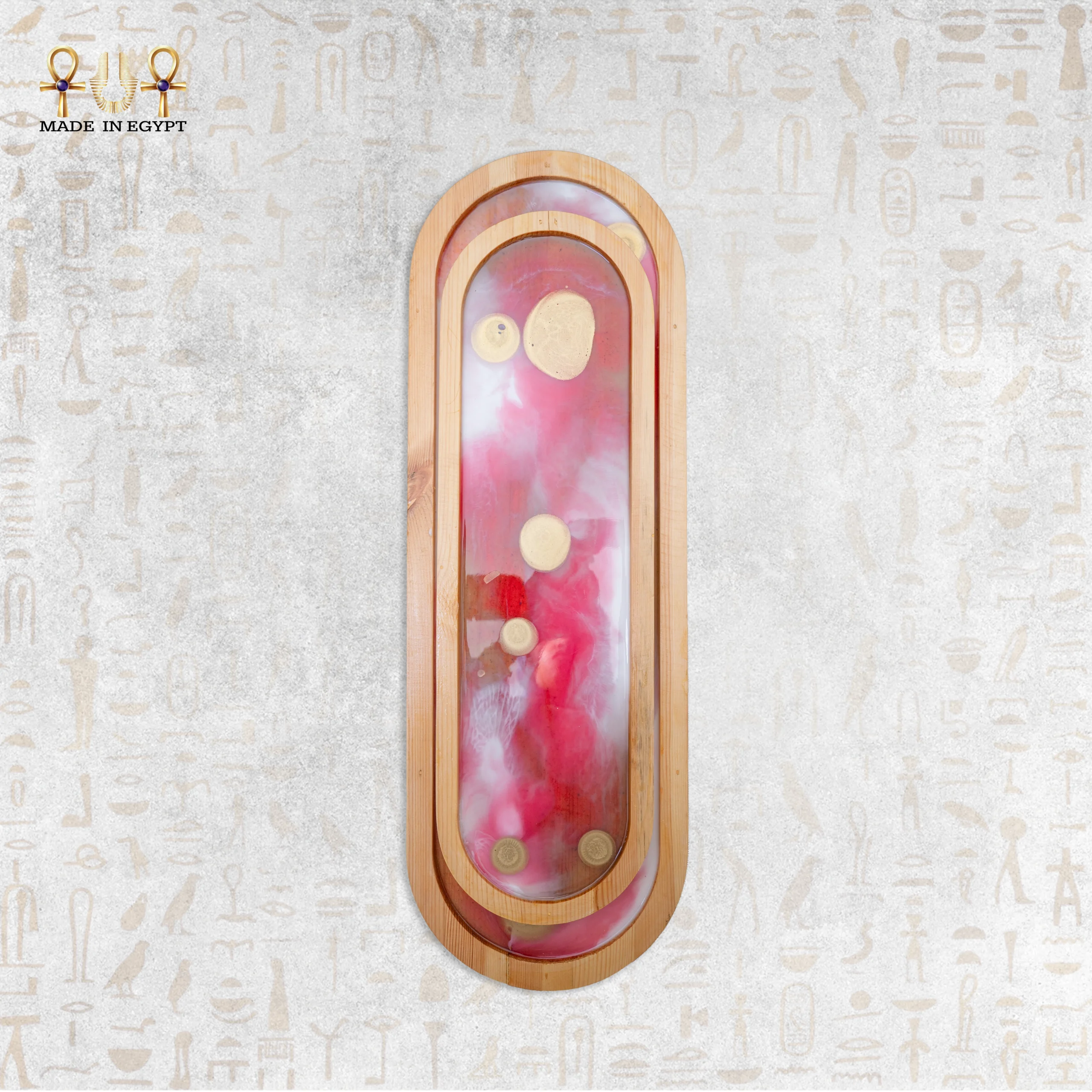 The Pink Mirage Tray is a handcrafted fusion of natural wood and resin, featuring elegant pink and golden hues that bring warmth and sophistication to any space. Perfect as a serving piece or a decorative statement of Egyptian craftsmanship.