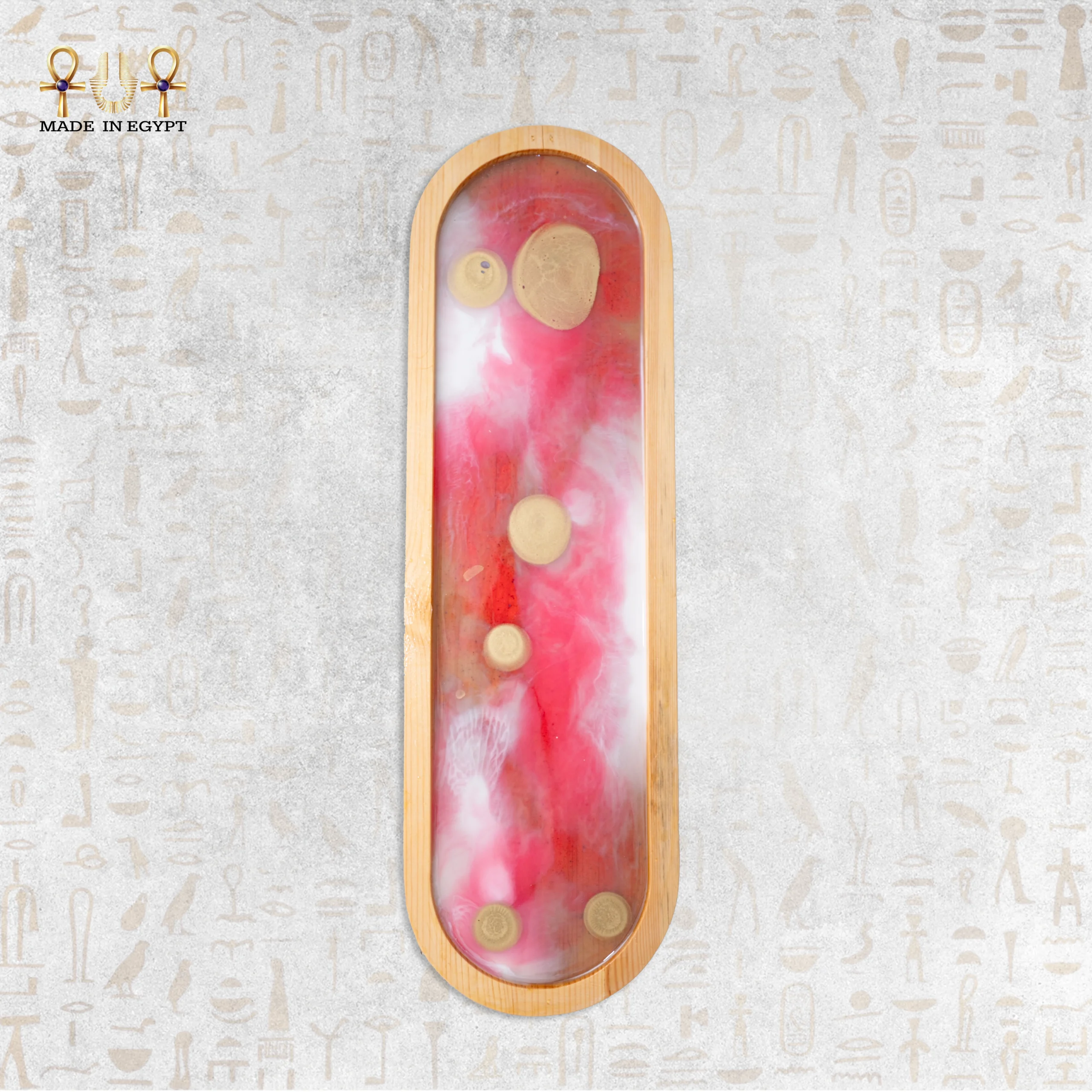 The Pink Mirage Tray is a stunning piece of Egyptian craftsmanship. Handcrafted with care, it blends natural wood with transparent resin to create a unique fusion of art and function. Soft shades of pink swirl through waves of white and shimmering gold, evoking the dreamy image of a pink mirage under the Egyptian desert sun.
