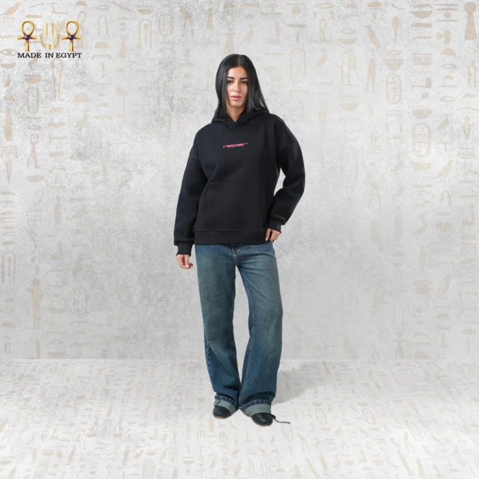 The back features a striking neon pink print of the Great Sphinx, inspired by a vintage Egypt postage stamp. This vibrant artwork symbolizes protection, mystery, and resilience. Each intricate detail reflects the fusion of ancient symbolism with modern creative expression. On the front, the embroidered Neper logo adds a refined, polished touch, elevating the hoodie’s overall aesthetic.