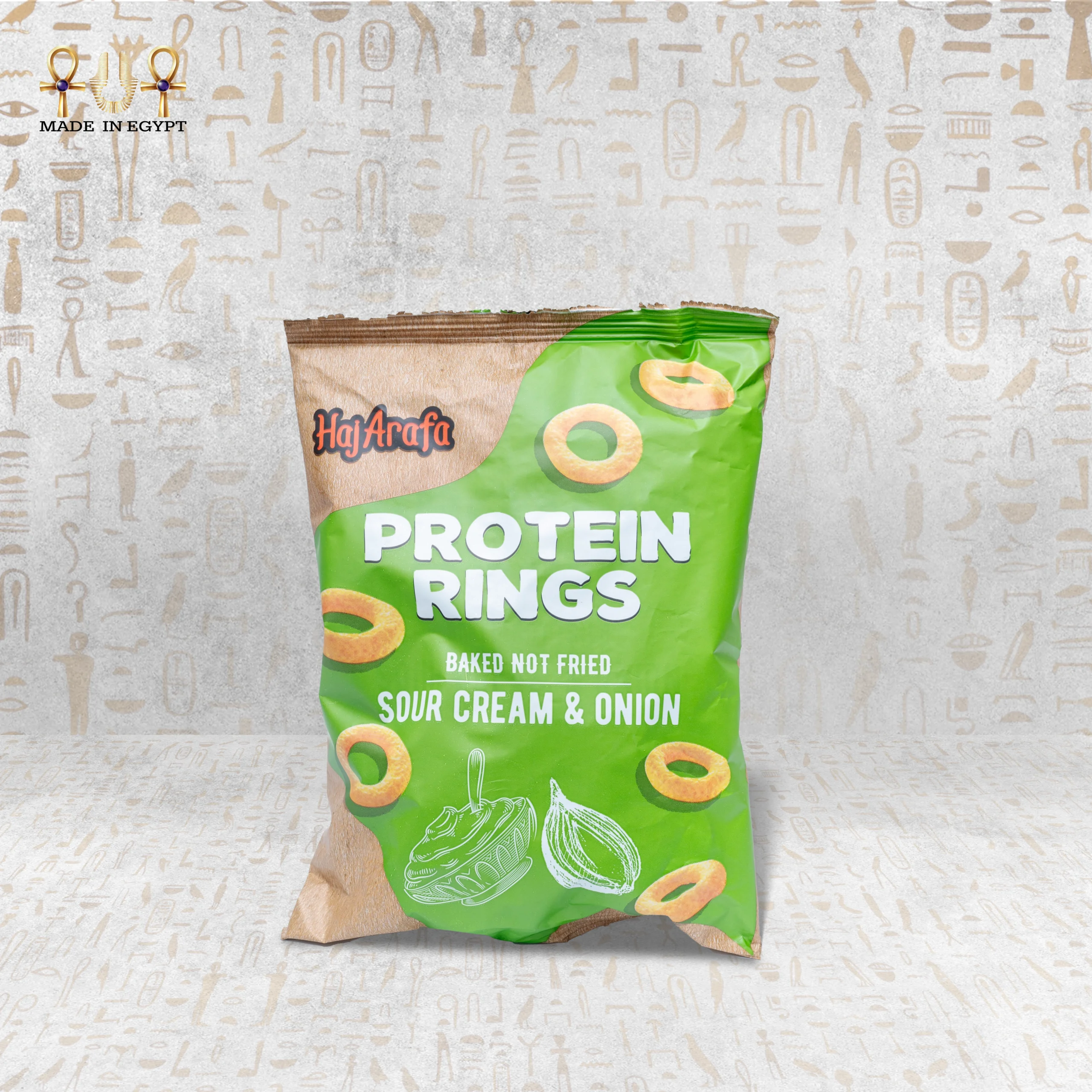 Haj Arafa Protein Rings are a healthy snack with sour cream & onion flavor. Baked, not fried, protein-rich, and perfect for daily life.