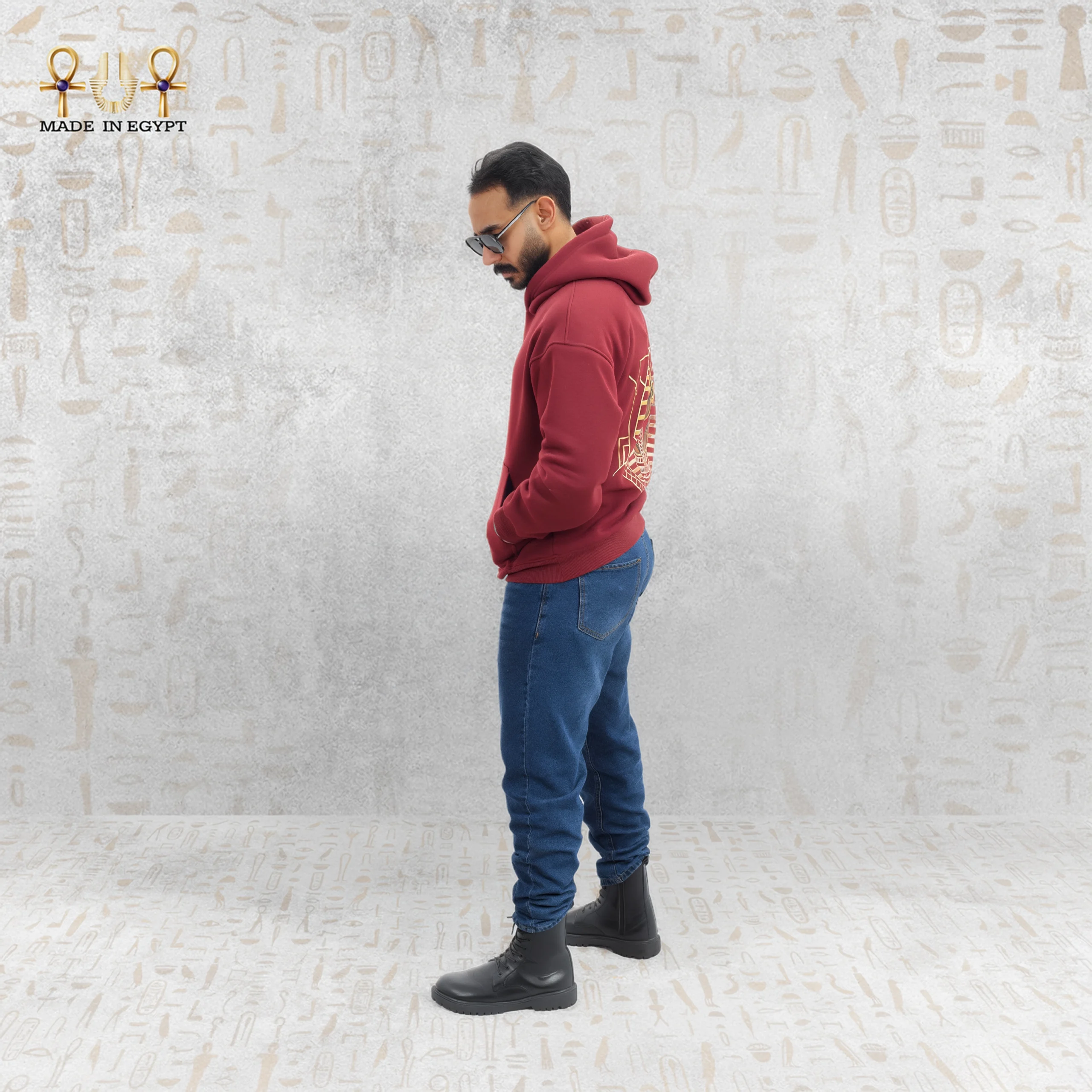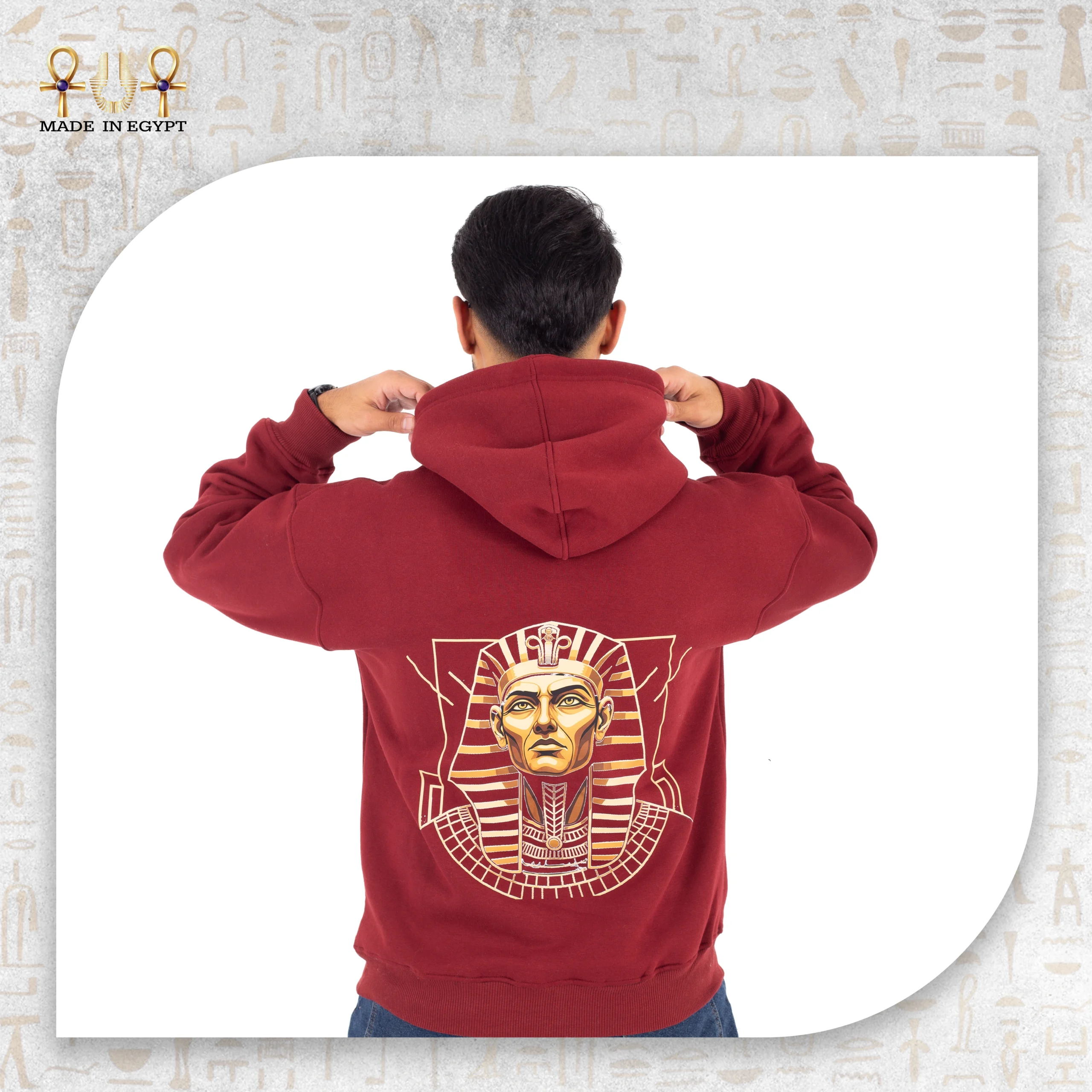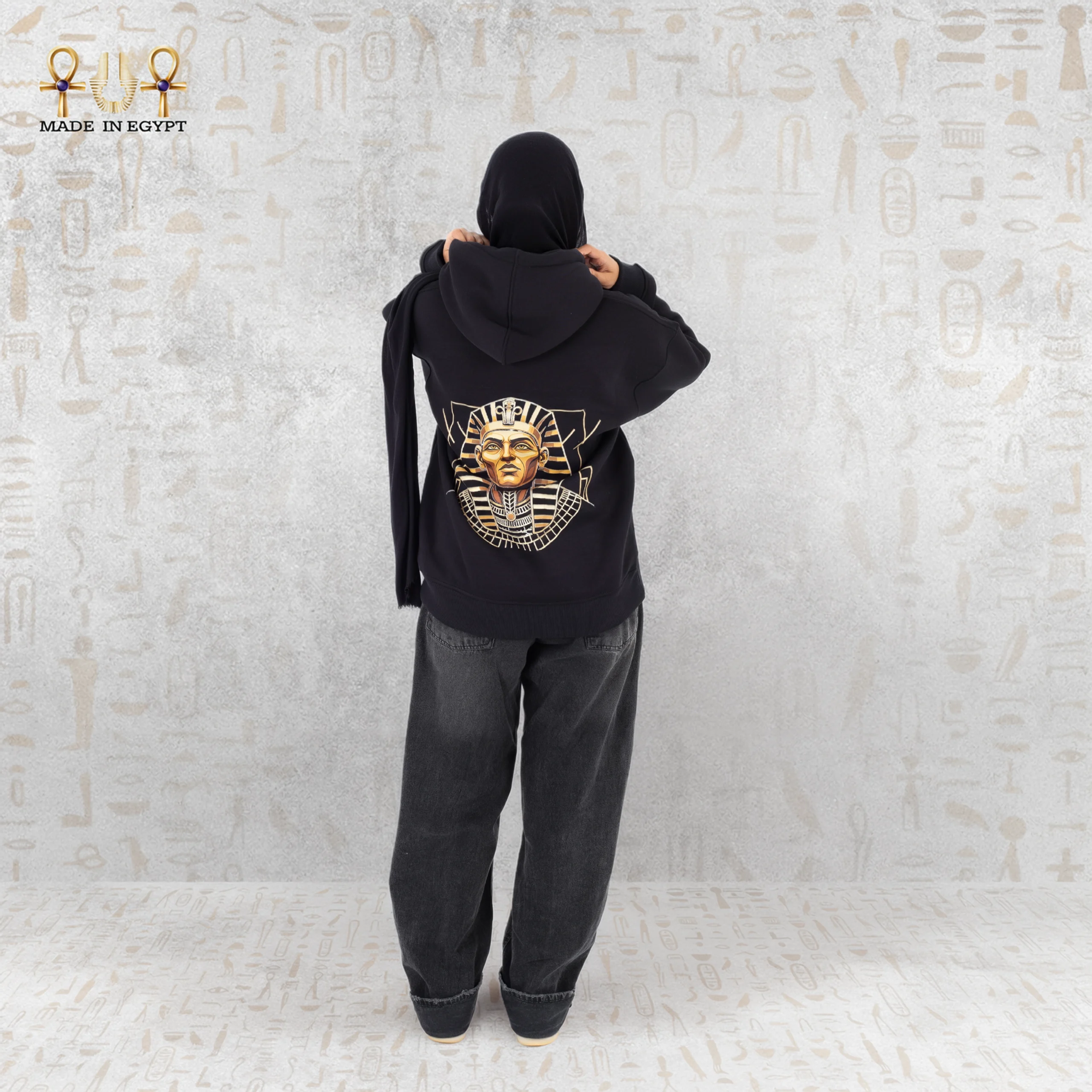 The front design remains minimal, featuring a small Pharaonic emblem on the chest. This subtle detail balances the bold back artwork. Therefore, the hoodie delivers refinement from the front and impact from behind.